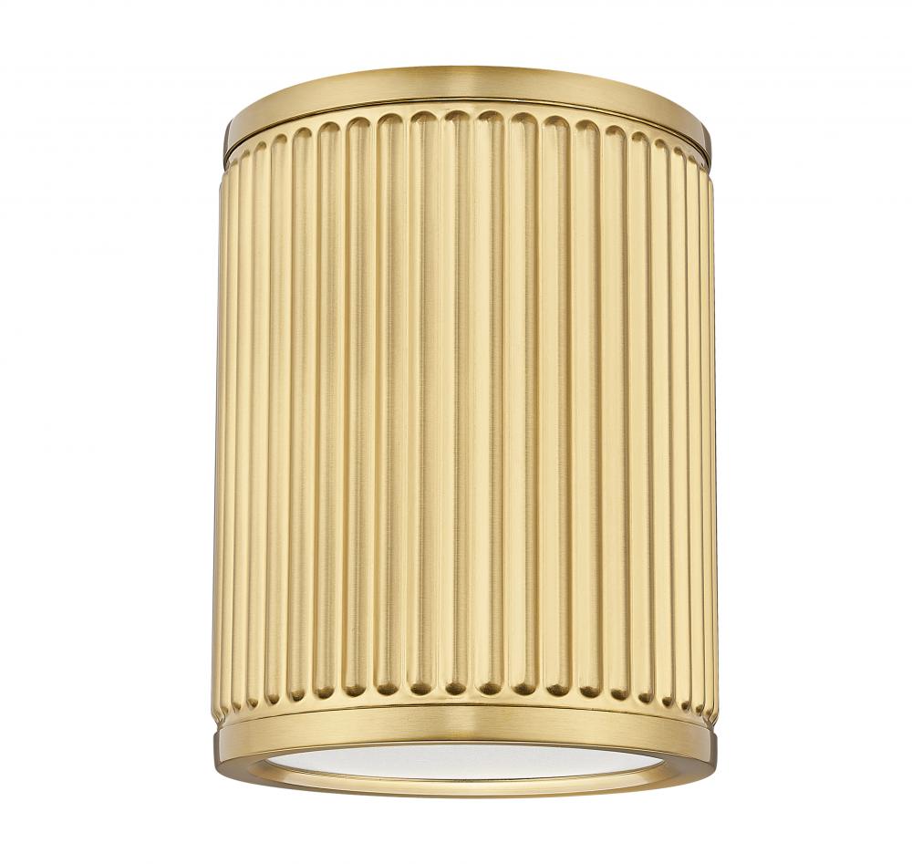 A chic ribbed design and modern gold finish bring warmth and sophistication to a contemporary flush mount LED ceiling light. Its an energy efficient design with an understated cylindrical silhouette, perfect for a multitude of spaces within your stylish home. Its integrated LED is tucked behind a frosted acrylic diffuser to deliver impeccable illumination in any setting.
