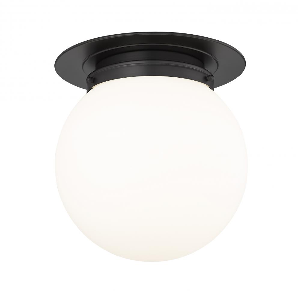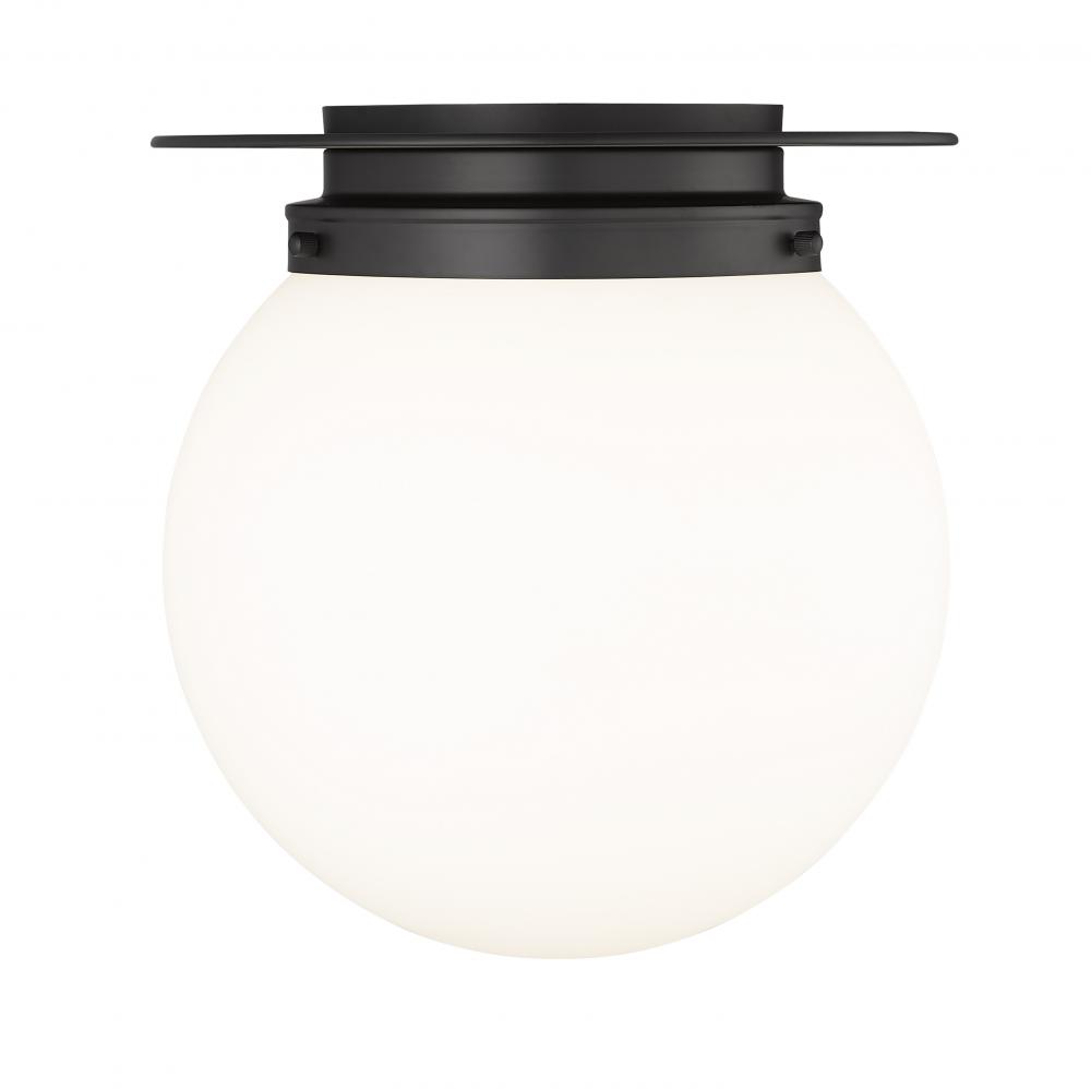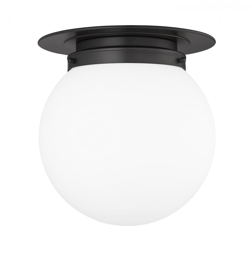 Mid-Century Modern and Schoolhouse styles reflect in this one-light flush mount from the Calhoun collection, delivering a clean artistic look in any application. This chic fixture stands out with a white glass globe attached to matte black finish steel framing and accents, creating a bold signature statement with easy style.