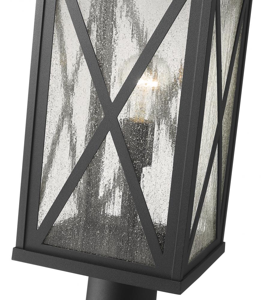 This one-light outdoor pier mounted fixture has a broad base, and comes in a box-shaped black aluminum cage with a clear seedy glass finish. It softly diffuses light to provide a welcoming glow to your front entrance or patio. Compelling X-accents bring dimension and character.