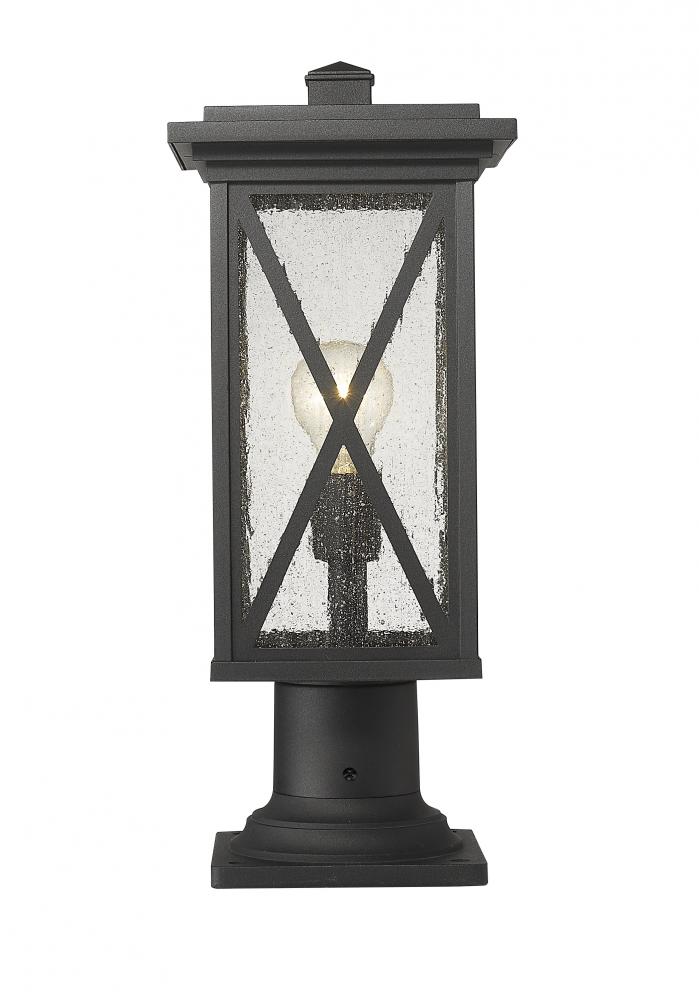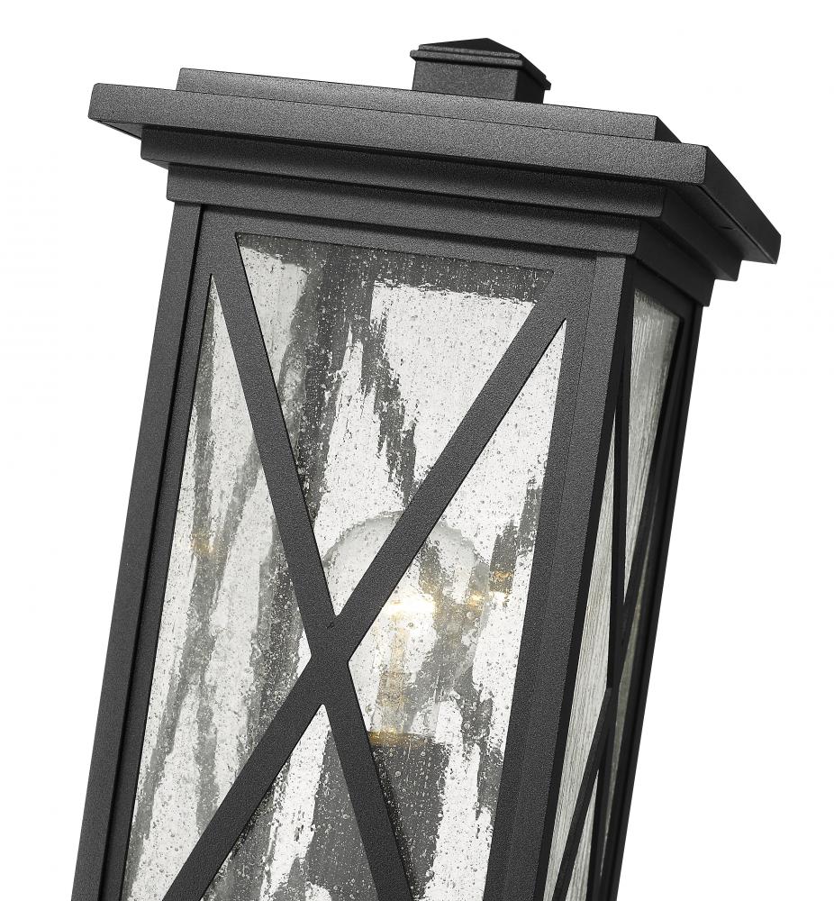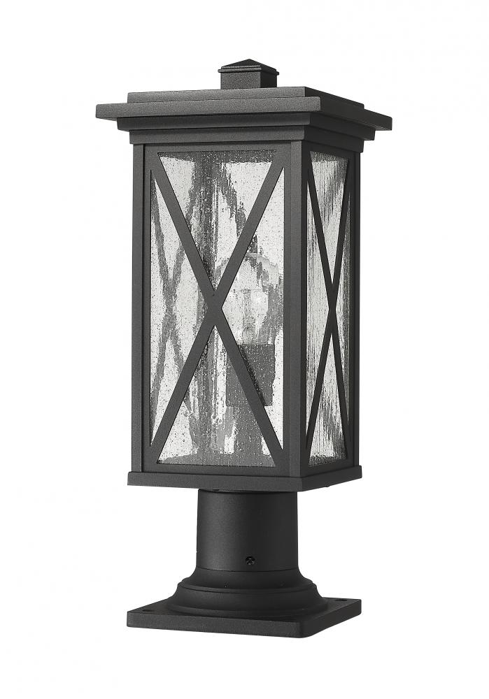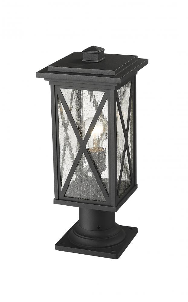 This one-light outdoor pier mounted fixture has a broad, square base, and comes in a box-shaped black aluminum cage with a clear seedy glass finish. It softly diffuses light to provide a welcoming glow to your front entrance or patio. Compelling X-accents bring dimension and character.