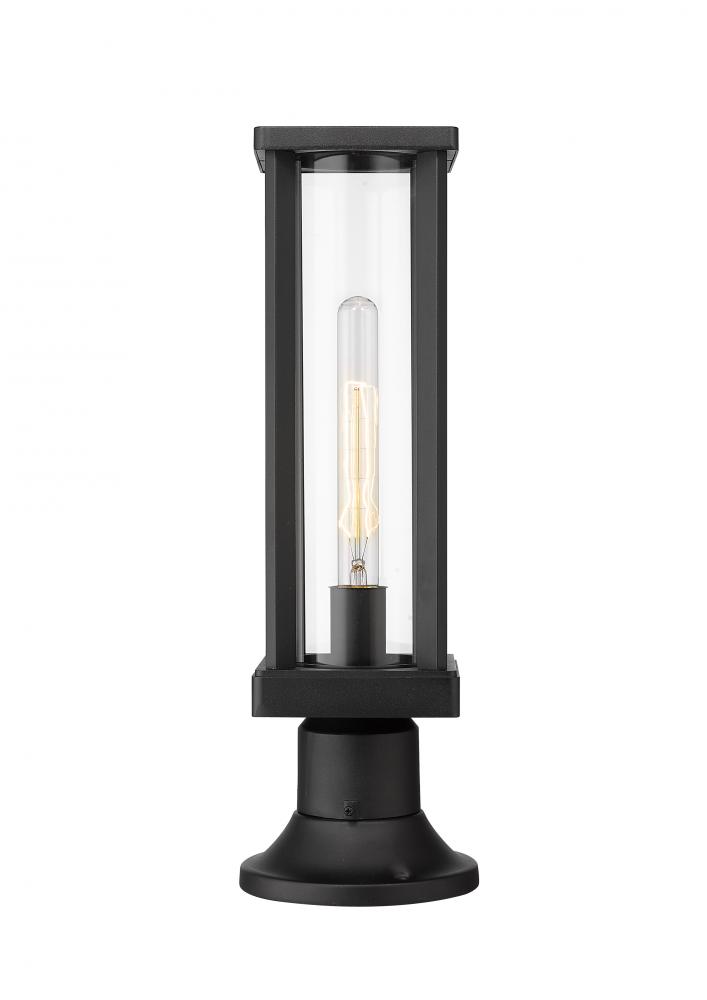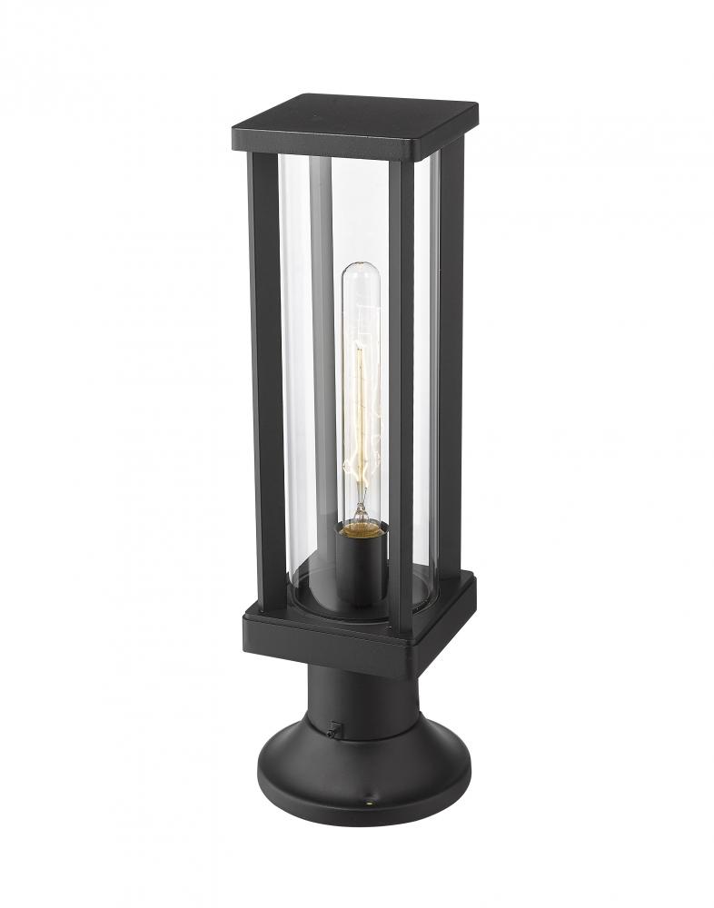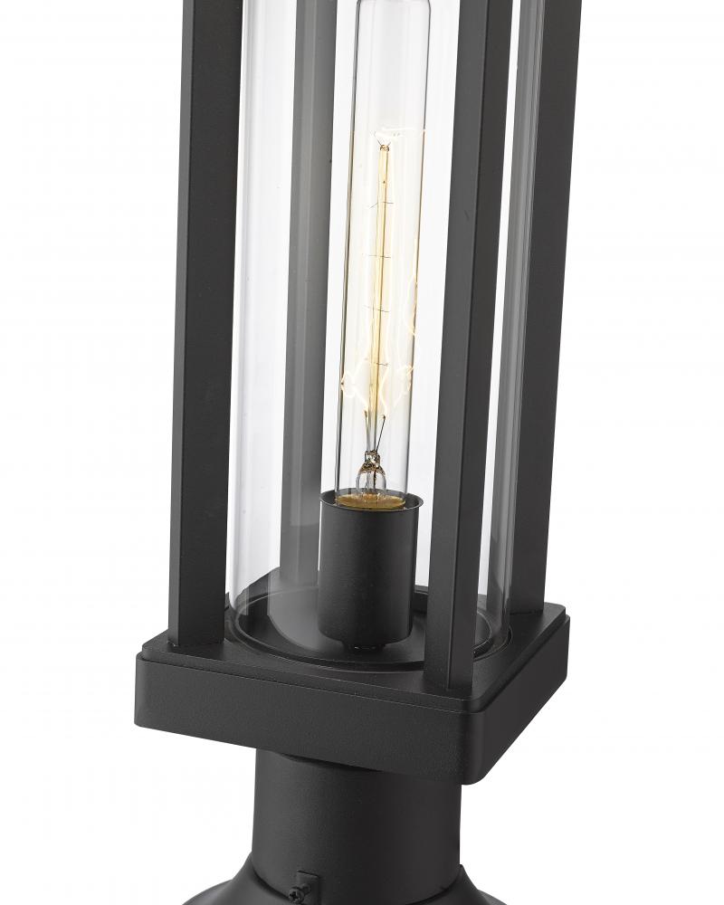 As part of the Glenwood lighting collection, this contemporary outdoor pier mounted fixture is perfectly suited for driveway columns and patio railings. Encased in a rectangular, ultra-modern aluminum frame, this lighting piece features a tube-style clear glass lantern that displays a bright bulb while protecting it from the elements. With a dark black finish throughout the frame and pedestal base, this pier mounted lantern fixture complements a variety of architectural facade styles and color palettes.