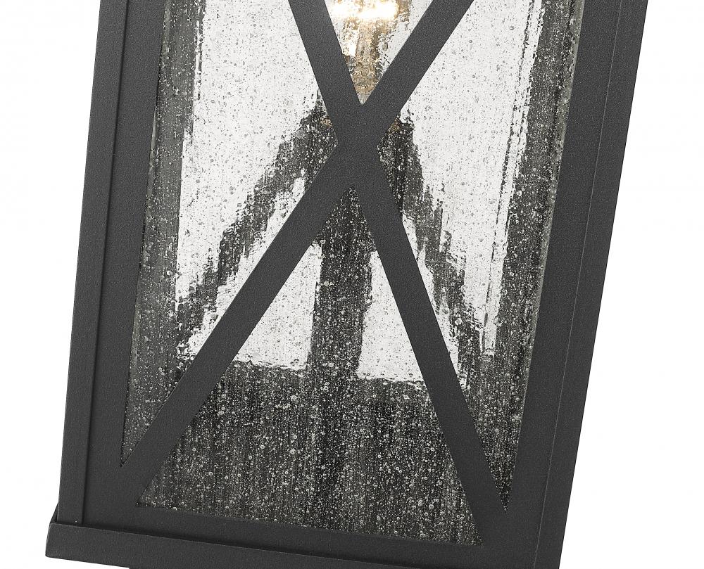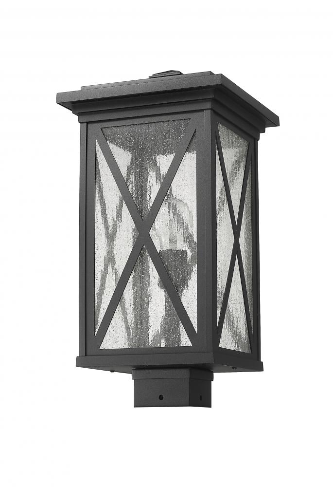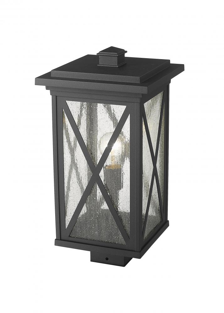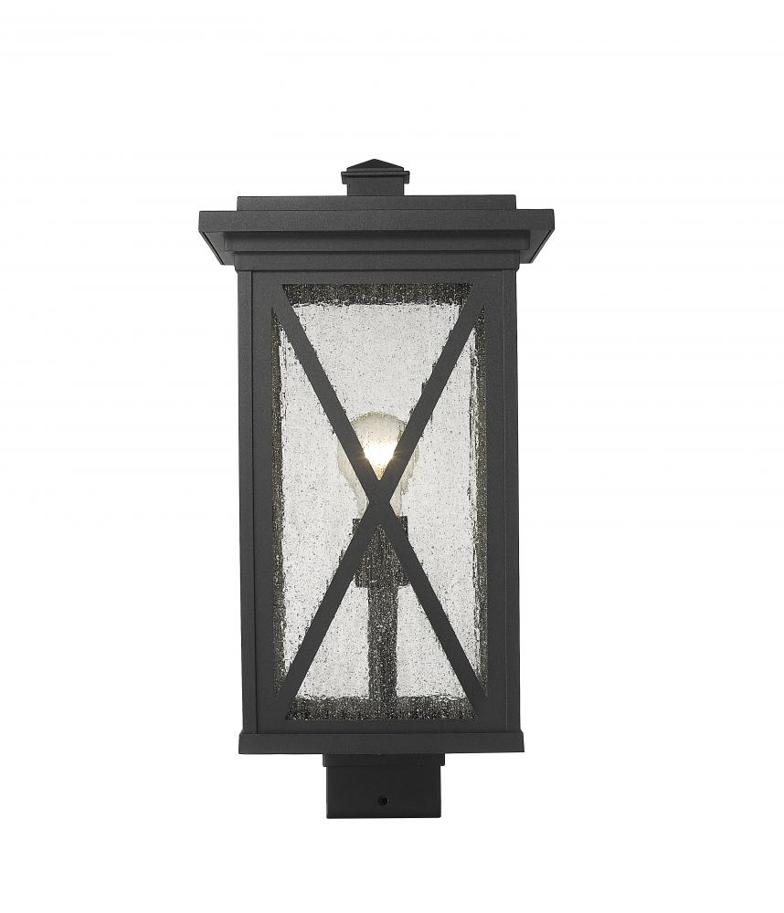 This one-light outdoor post mounted fixture comes in a box-shaped black aluminum cage with a clear seedy glass finish. It softly diffuses light to provide a welcoming glow to your front entrance or patio. Compelling X-accents bring dimension and character.