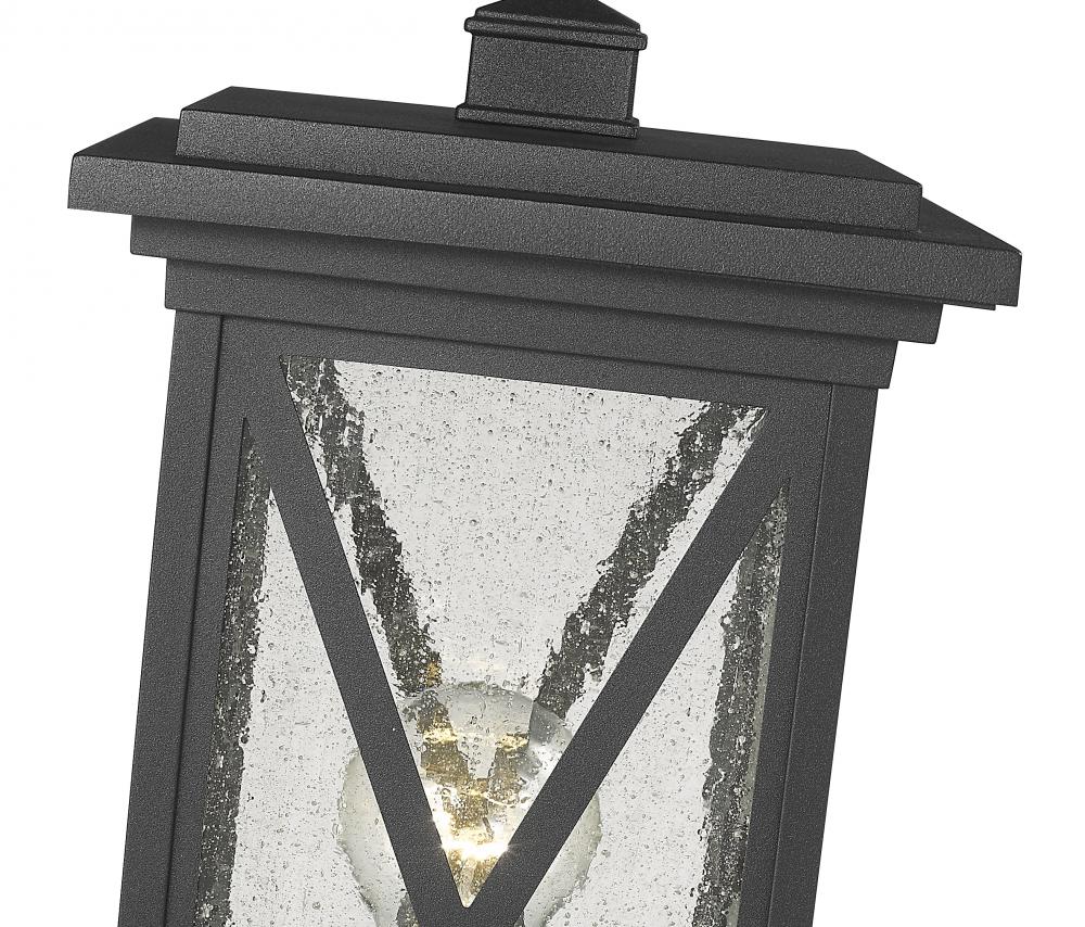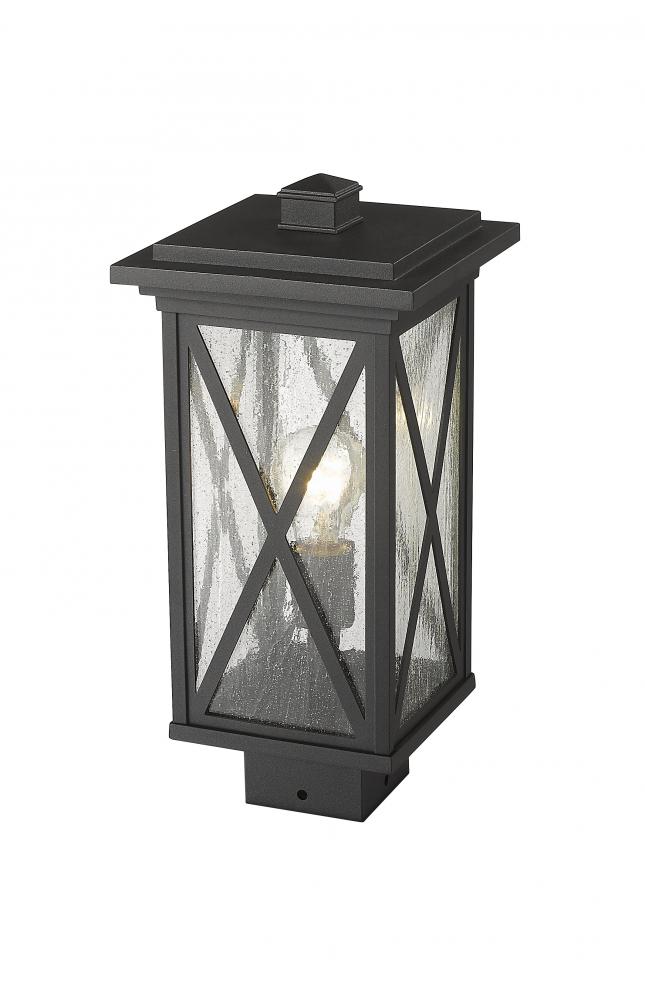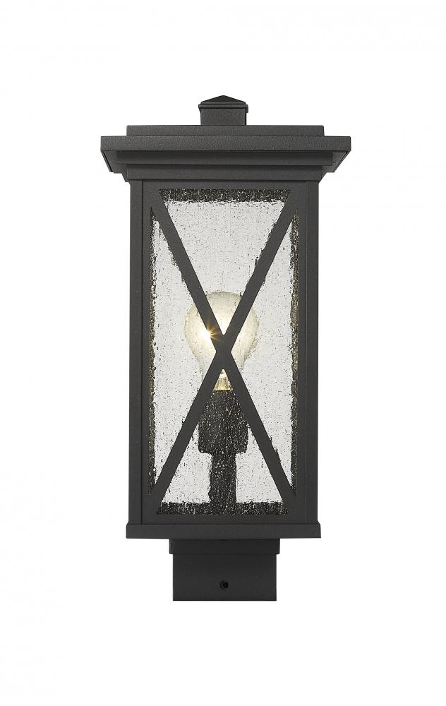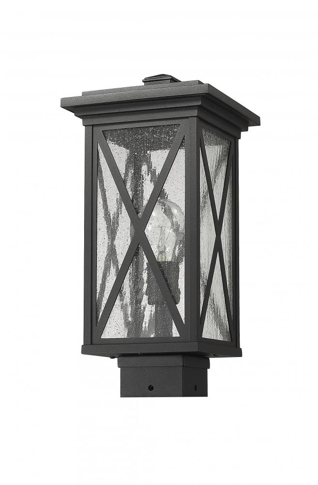 This one-light outdoor post mounted fixture comes in a box-shaped black aluminum cage with a square post attachment. Compelling X-accents bring dimension and character. Its clear seedy glass finish softly diffuses light to provide a welcoming glow to your front entrance or patio.
