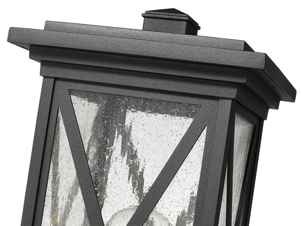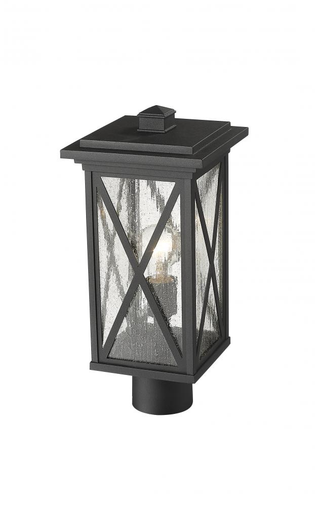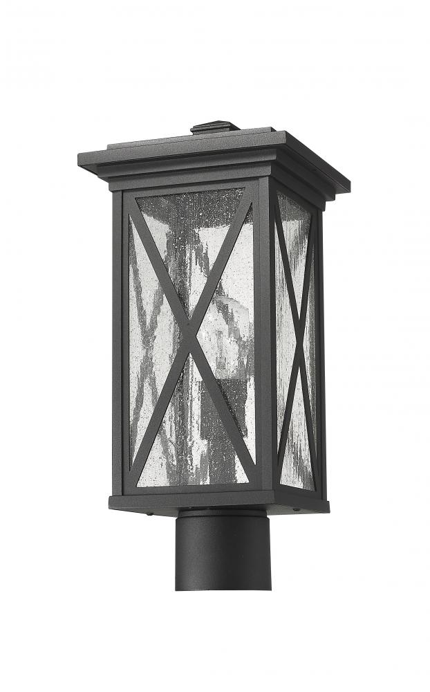 This one-light outdoor post mounted fixture comes in a box-shaped black aluminum cage with a rounded post attachment. Its clear seedy glass finish softly diffuses light to provide a welcoming glow to your front entrance or patio. Compelling X-accents bring dimension and character.