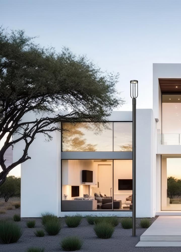 The selectable color temperature feature of modern one-light outdoor post mount fixture means you get to choose the right ambiance for all your exterior spaces. Perfect for your deck, patio, or walkway, the light features an energy efficient LED and a sand black finish for durability, all complementing a sleek silhouette that includes an open cage lantern with a teardrop shape that adds graceful elegance.