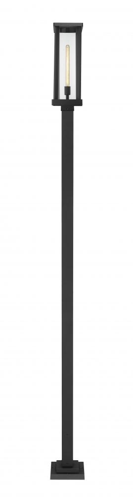 Perfect for casting light along a landscaped pathway, this outdoor post mounted fixture from the Glenwood collection features a contemporary style perfect for more modern homes. Its tall, slender design along with a sophisticated dark black finish and cage-style aluminum lantern allows this lamppost style lighting fixture to complement any building material without clashing. In addition, its cylindrical clear glass globe encases and protects the bulb from the elements while still displaying a full, bright glow.