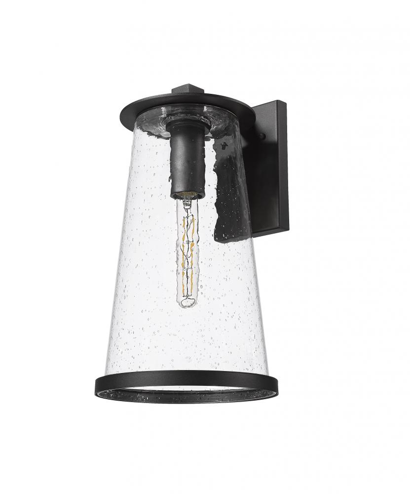 Distinctive rims encase clear seedy glass to create a bold, artistic look for a modern outdoor wall light from the Bar Harbor collection. Simply charming flanking a garage or front entryway, the light boasts a lantern-inspired silhouette streamlined for a contemporary ambiance that overflows with character. A marine-grade sand black finish is lasting and built for durability in outdoor environments, perfect for virtually any space.
