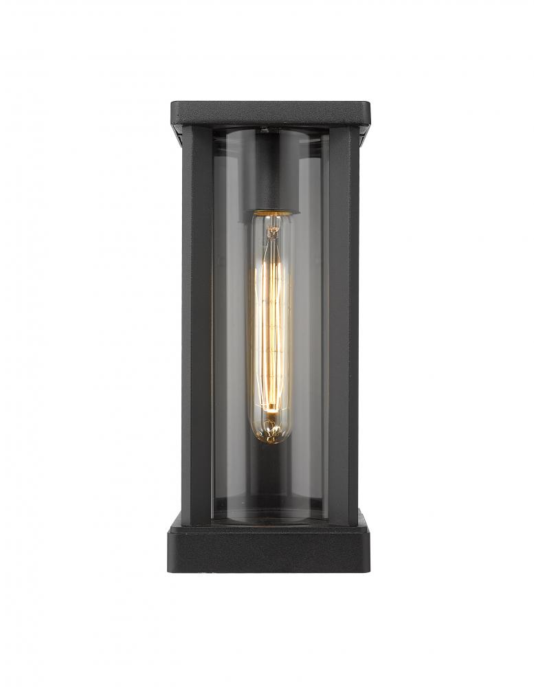 From the Glenwood collection comes this sophisticated and contemporary outdoor wall sconce, which includes a clear glass cylinder globe held by a thin, cage-style aluminum frame. Featuring an elegant, dark black finish that complements your homes already existing facade, this wall sconce lends a striking, handsome element to any outdoor entertainment space. Take several of these sconces and flank a sliding glass door or surround a deck railing for a classy, understated look, while allowing ample lighting for hosting al fresco dinners or late night talks.