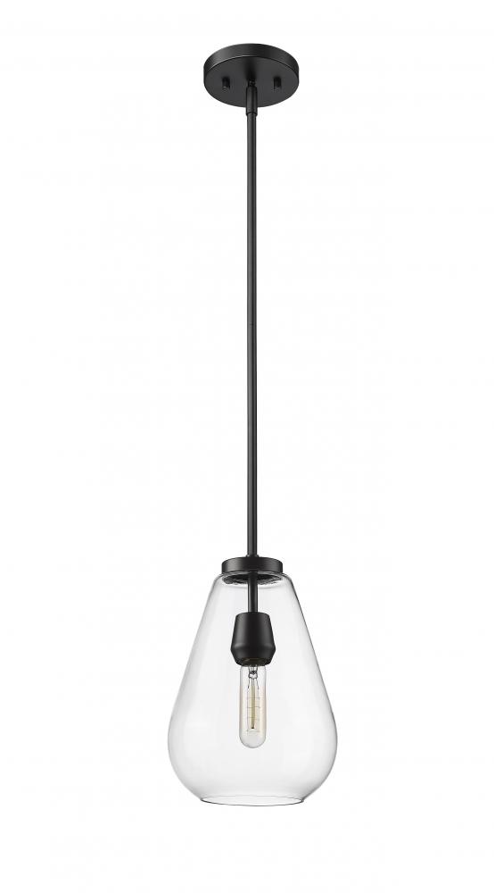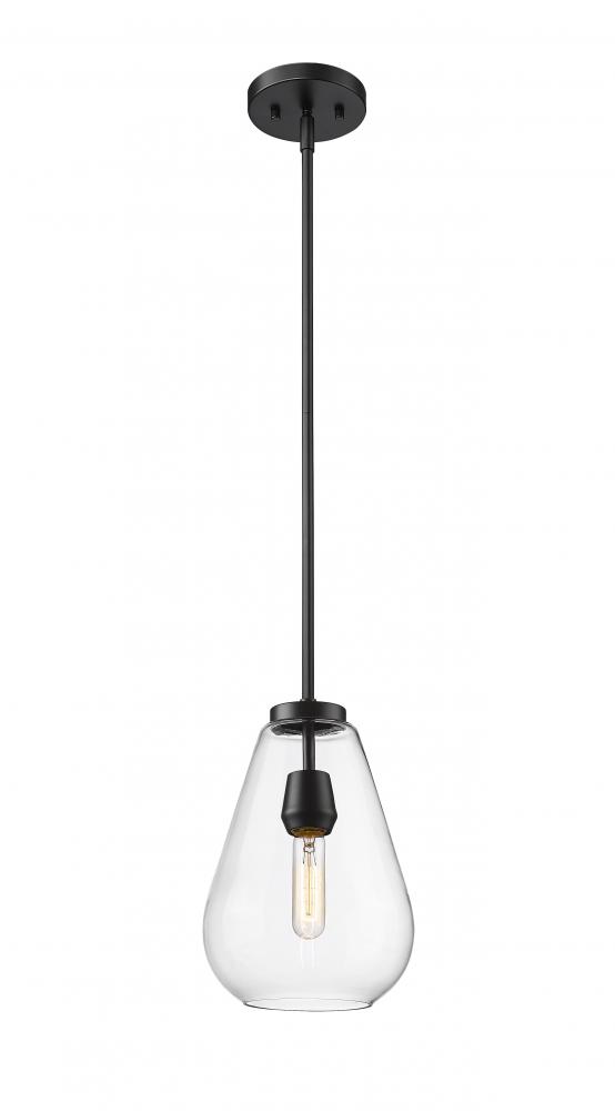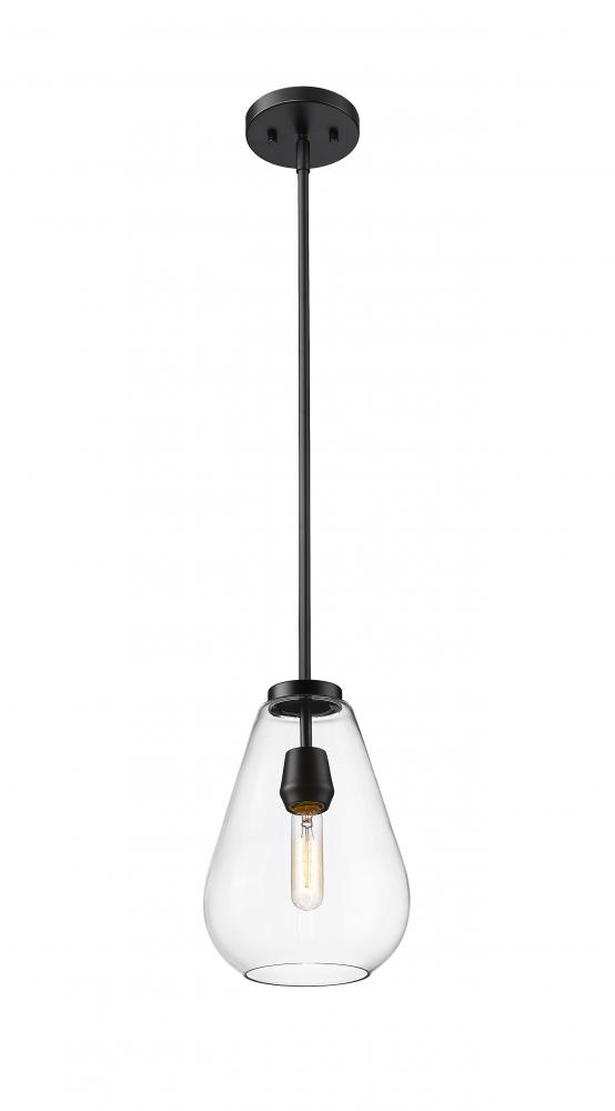 An eye-catching one-light pendant perfectly encapsulates the modern aesthetic. The tapered bell-shaped shade is made from clear glass, suspended from a steel frame with a sleek matte black finish. The fixture brings a chic cutting edge to a contemporary kitchen or dining room.