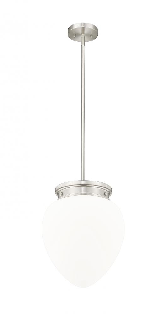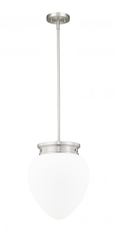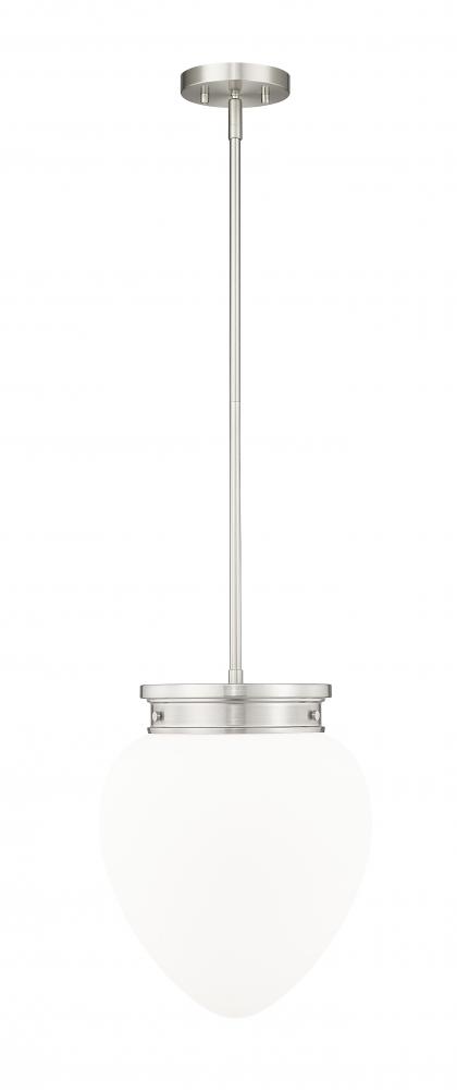 Schoolhouse inspired glass and a chic silhouette highlight a modern one-light pendant. Its timeless brushed nickel finish complements in your kitchen or dining room, with the versatility to blend beautifully in a bedroom or den. Its teardrop-style shade is crafted from matte, etched opal glass to deliver soft, diffused illumination in any setting.