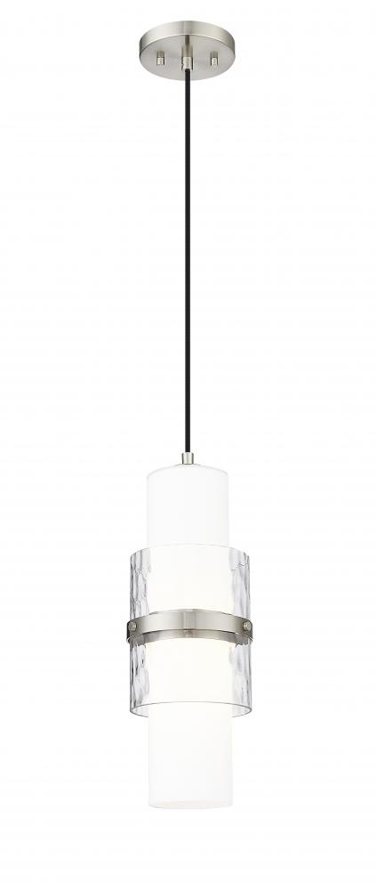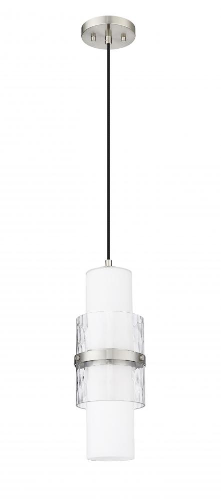 A modern style with a classic touch, the Cayden family features an opal white glass cylindrical shade, next we add a cylinder of textured glass finished off with a decorative cuff, and suspended with black braided cloth-covered cords that complete the stun
