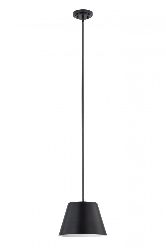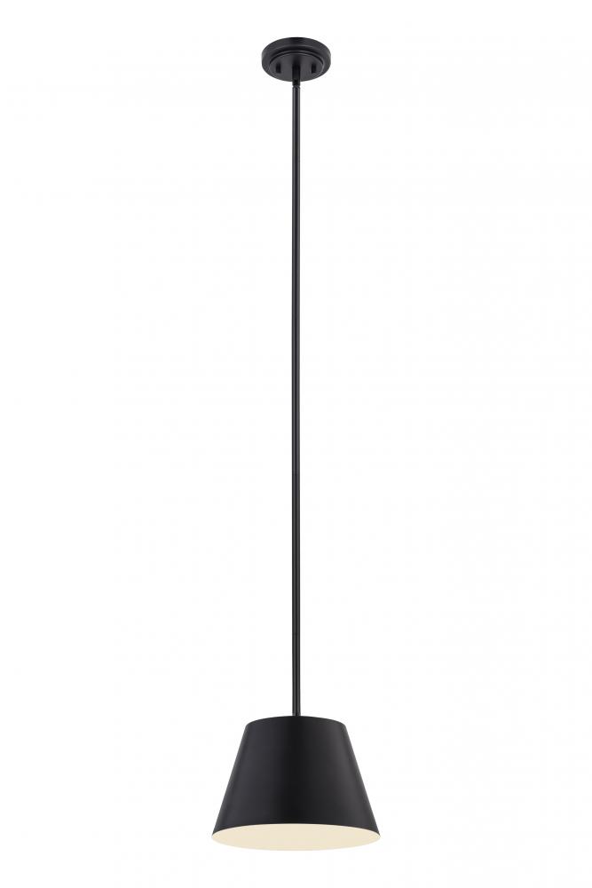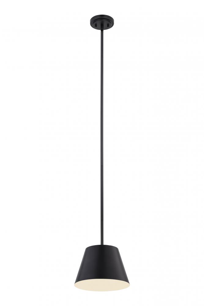 Chic in its simplicity, this modern pendant is a striking choice over a kitchen island, dining table, or living area. Refreshing in its matte black with a white interior shade finish, the pendant features a compact profile with a round canopy and a modern empire shade that tapers gently to create versatile illumination.
