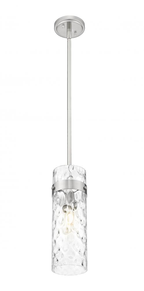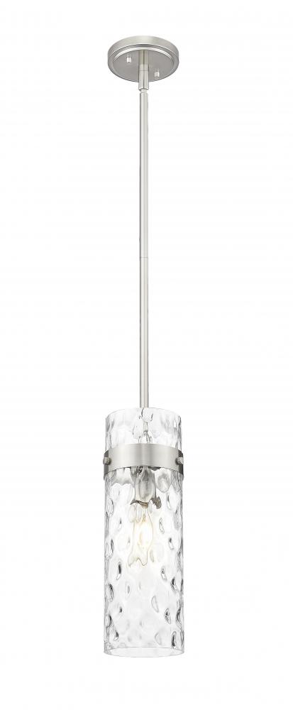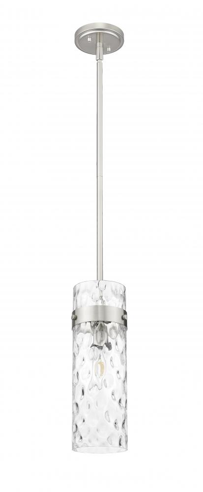Encourage a sophisticated ambiance with the luxe look and feel of this modern one-light pendant from the Fontaine collection. It pairs a cylinder of clear water glass with a brushed nickel finish collar and canopy and rods, offering refined, but understated luxury alone or in multiples over a larger space.