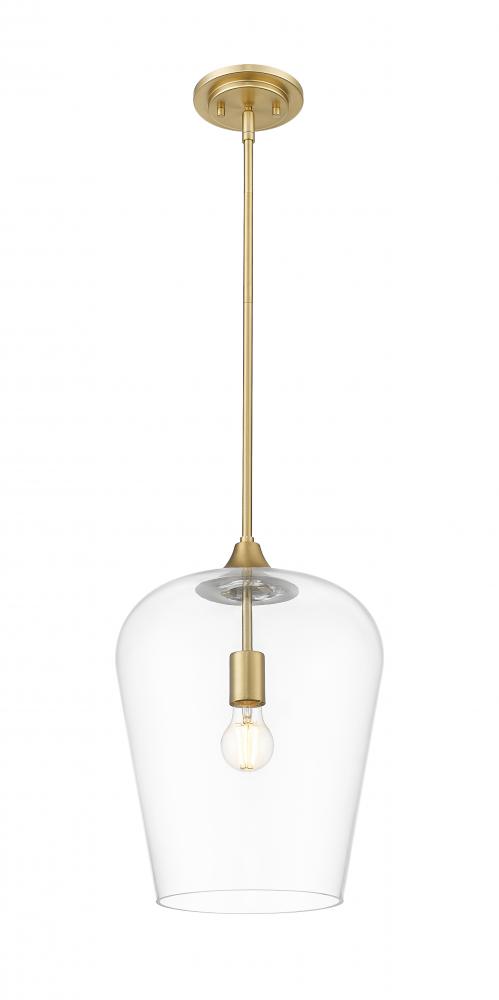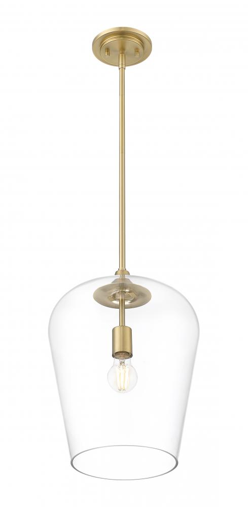Make this single-light glass and metal pendant a staple in any setting, drawing on its sophisticated motif and lush finish. Steel construction coated with burnished brass tones reflects simplicity as it suspends an inverted clear glass goblet shade filtering dimmable light and illuminating a corner living space or bedroom.