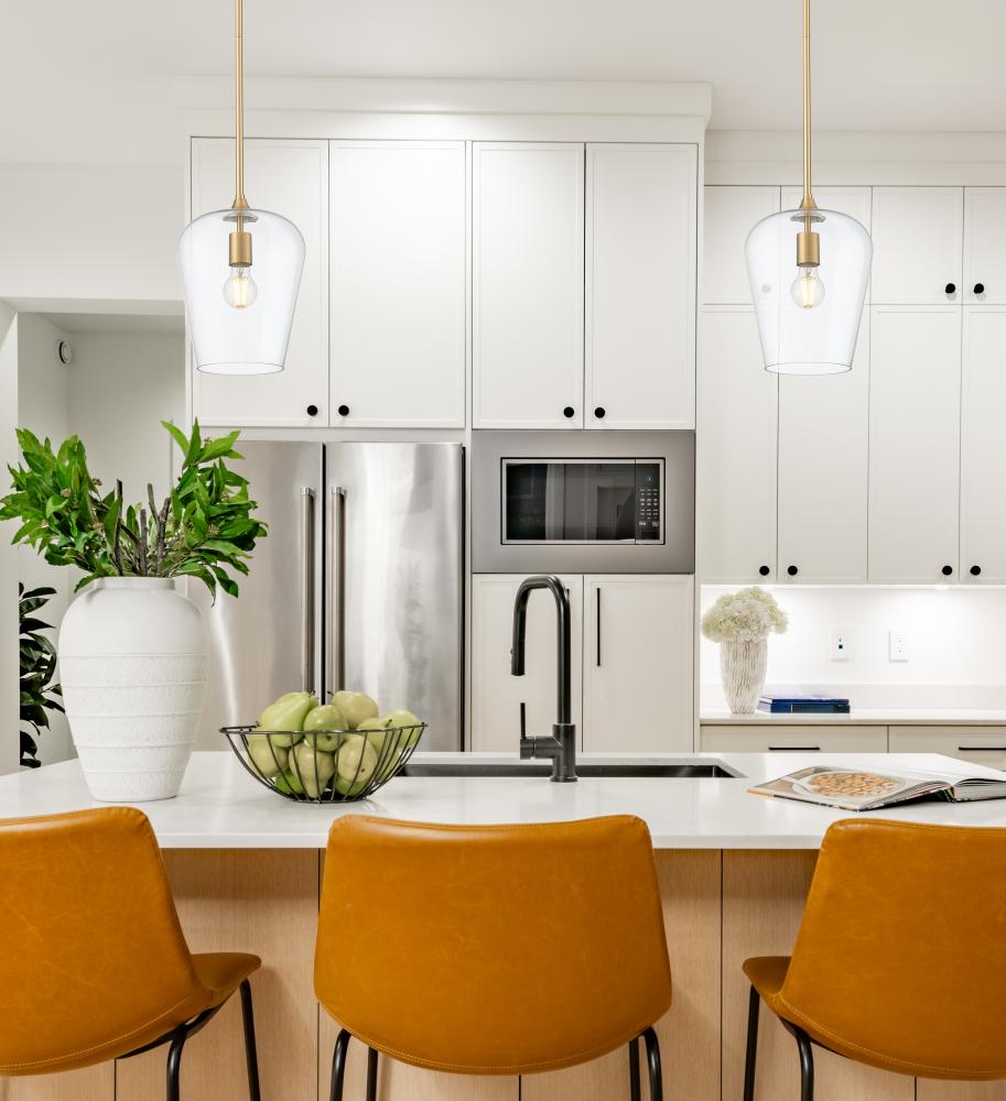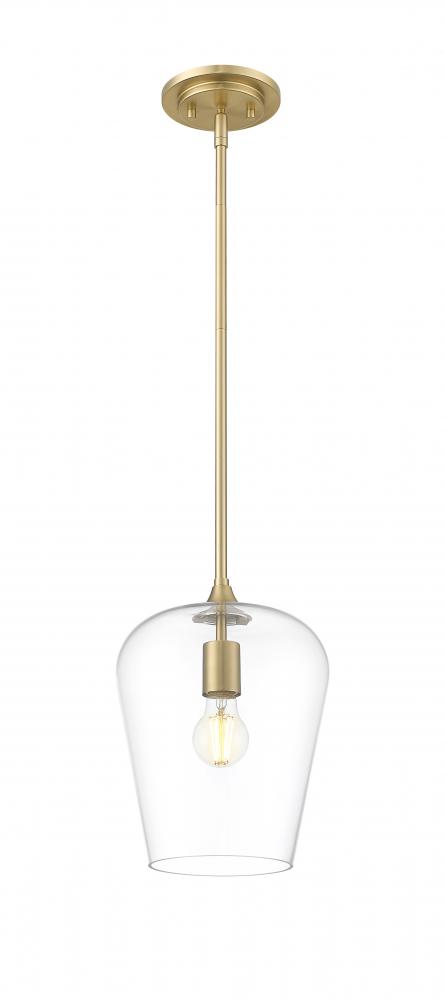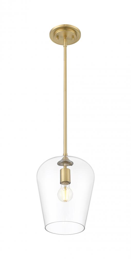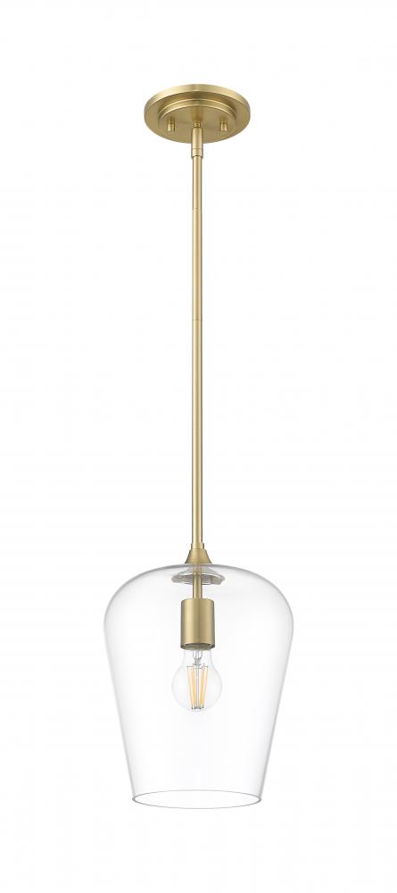 Soft artistry reflects in this single-light fixture blending metal and glass and offering a tasteful and timeless motif. Beautiful burnished brass finish steel framing and an inverted clear glass shade create simple silhouette with tons of elegance and versatility, as dimming features add important customization of high-level or low-level lighting.