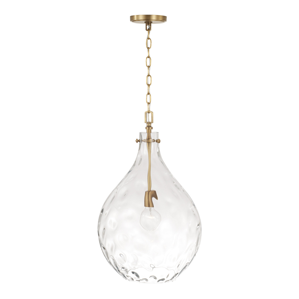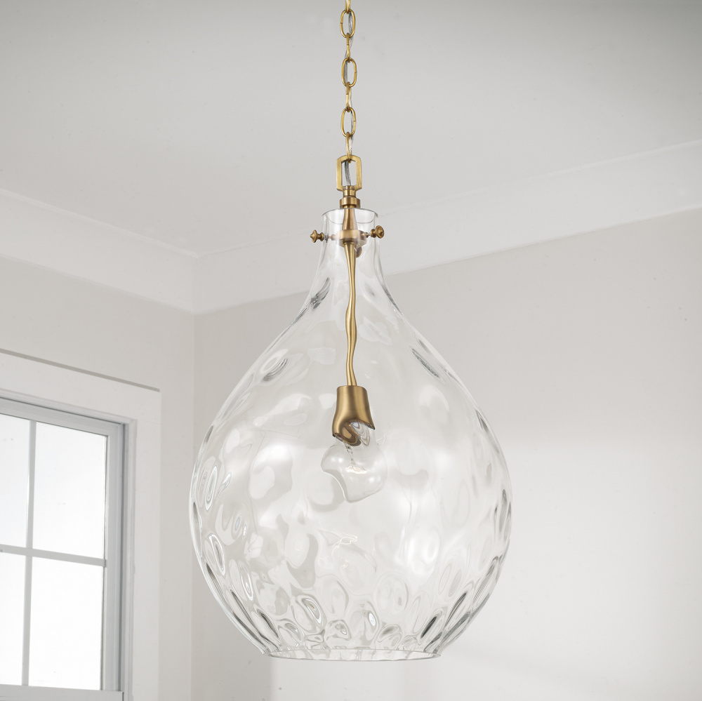 DETAILS: Clear Water glass creates compelling illumination in a teardrop silhouette, while the Aged Brass finish adds a classic touch.