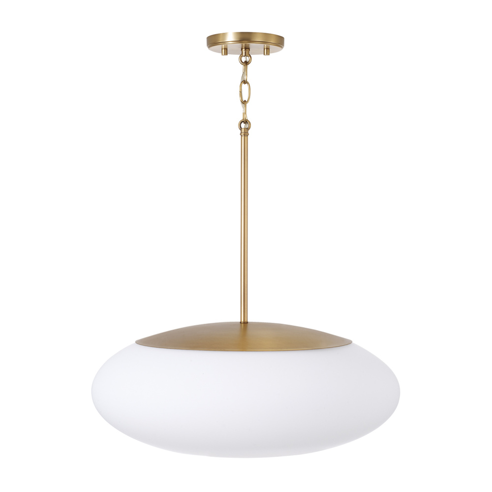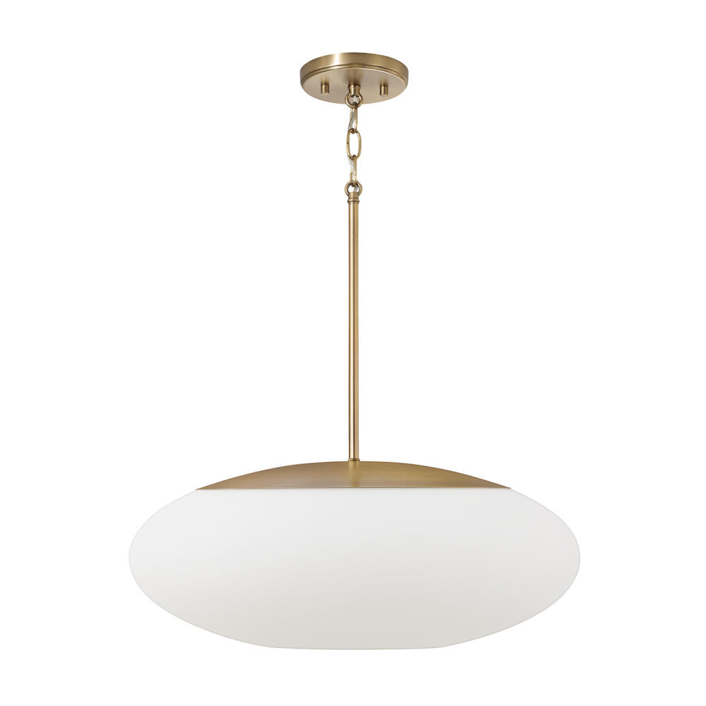 DETAILS: Open on the bottom, the Soft White oval glass globe brings crisp, classic style with an Aged Brass finish.