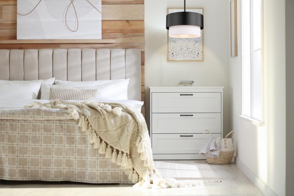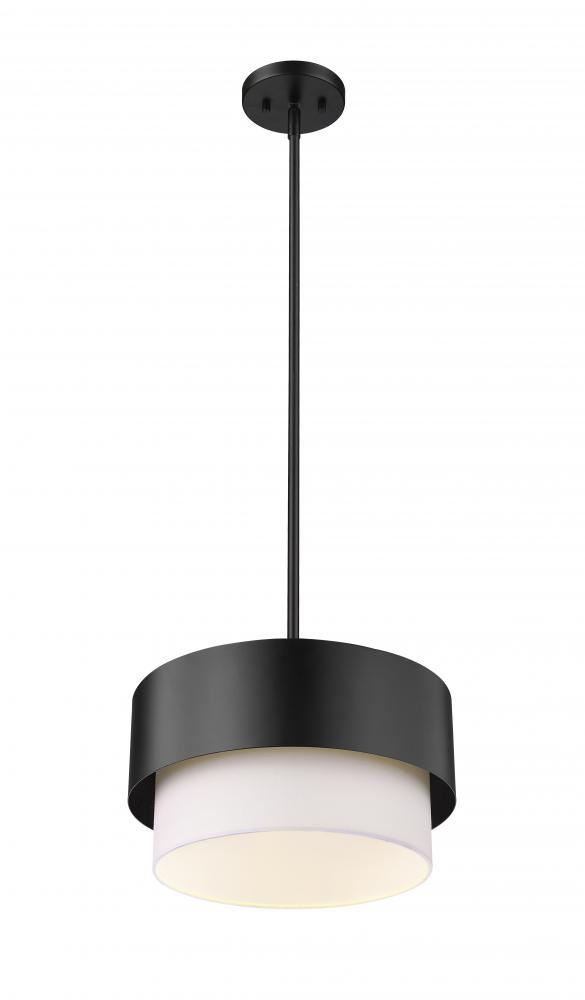 Unforgettable personality quirks follow the path of both Mid-Century Modern and Art Deco aesthetics in a stylish light fixture ideal for a kitchen, entryway, or main living area. Contemporary and transitional design schemes welcome this sleek pendant from the Counterpoint collection and make good use of an eclectic yet sensible style motif. Matte black finish steel framing and a soft white fabric shade adopt an optically pleasing circular silhouette that captures attention in any setting.