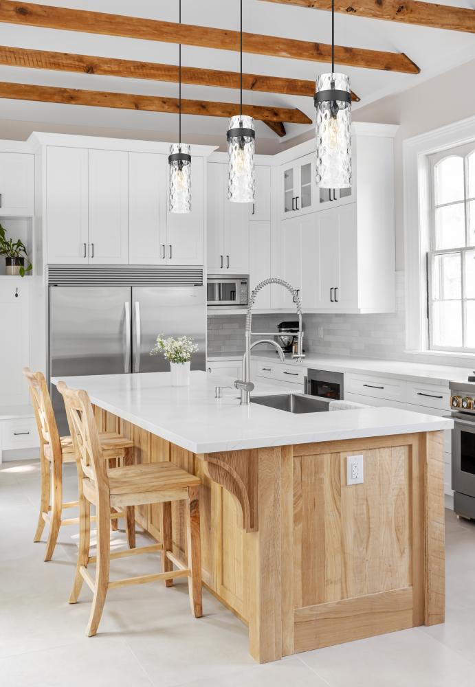 Bring bright, engaging illumination to your kitchen island or powder room with a modern one-light pendant. Its glam design focuses on a chic cylinder of rippling water glass, suspended with a matte black finish collar and canopy that creates wonderful contrast and depth.