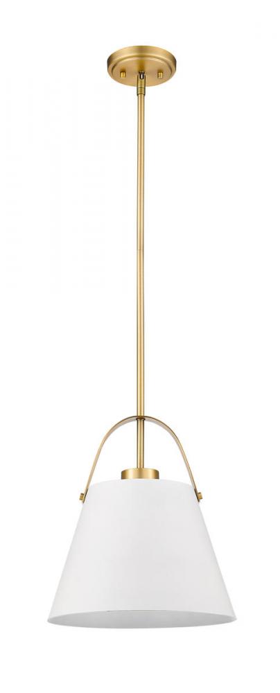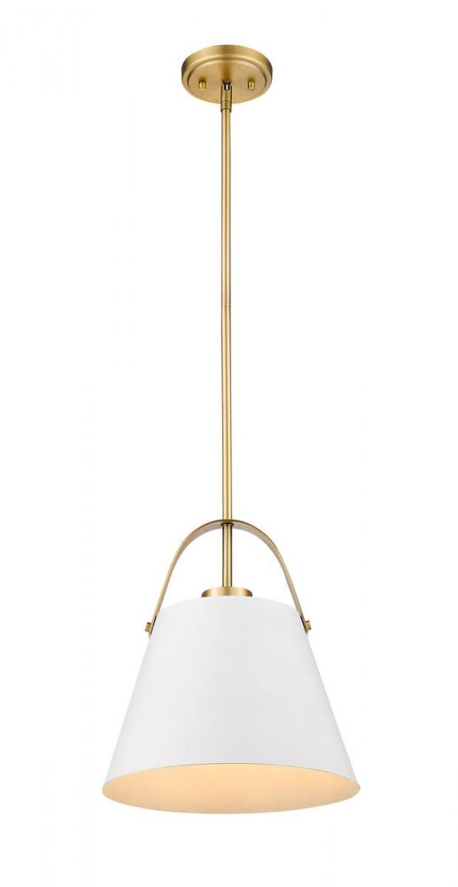 Incorporate design-forward illumination into a decadent contemporary d?cor scheme with this gorgeous one-light pendant. Bring targeted lighting to a dining or living area with a sleek fixture fashioned from Matte White and Heritage Brass metal, with a classic angled shade.