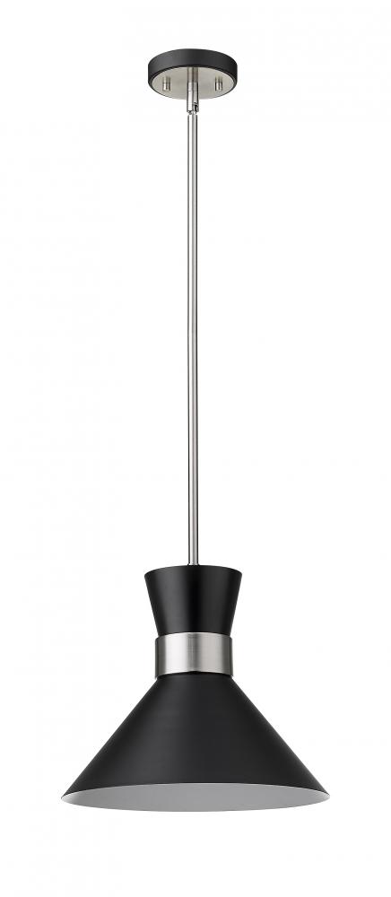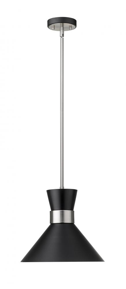 A decorative silhouette shapes industrial influence that adds casual elegance to this matte black finish metal pendant light. Dress up a main living space or entryway with this tasteful fixture trimmed with brushed nickel finish steel. This sleek pendant captures the heart of romantic industrial charm.