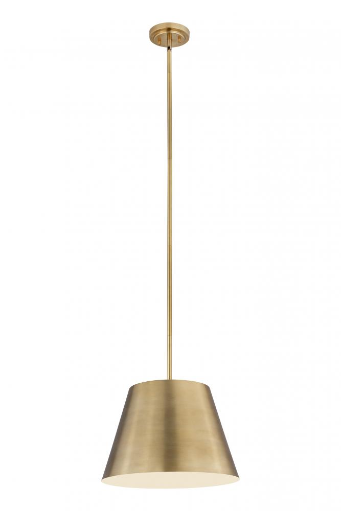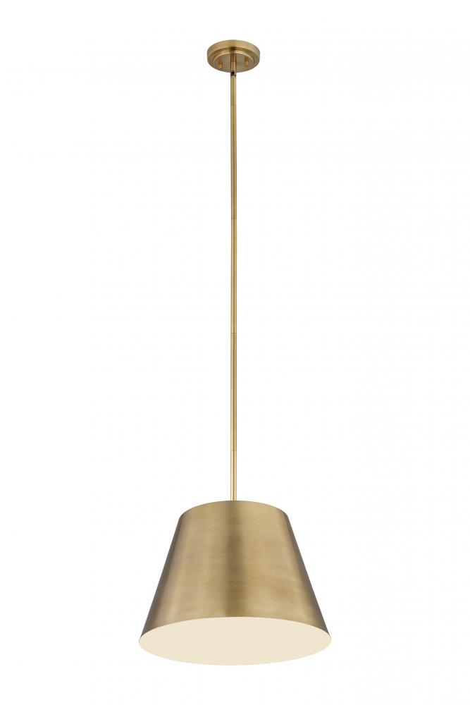 Elevate a modern kitchen or living area with the chic simplicity of this one-light pendant. Its versatile size is complemented with a contemporary empire shade, made from metal with a rich rubbed brass finish that pairs perfectly with a white interior to ensure bright, diffused illumination.