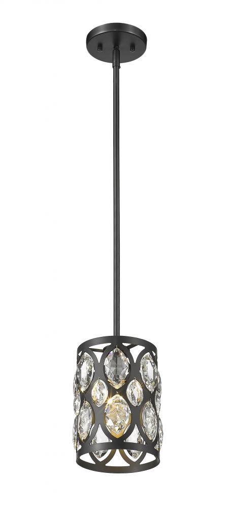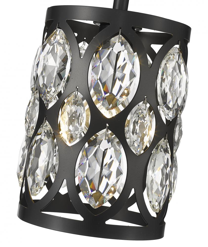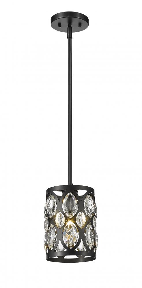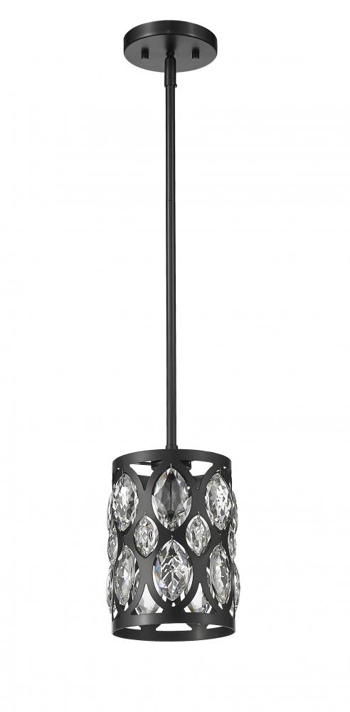 From the Dealey collection comes this graceful and contemporary mini pendant, complete with a drop down rod and disc-shaped mount. This elegant mini pendant also features a matte black steel shade with striking ellipse-shaped cut outs, each set with a glitzy clear crystal droplet that add a glamorous flair. Hang this mini pendant above a kitchen bar or bedroom nightstand for a dramatic look.