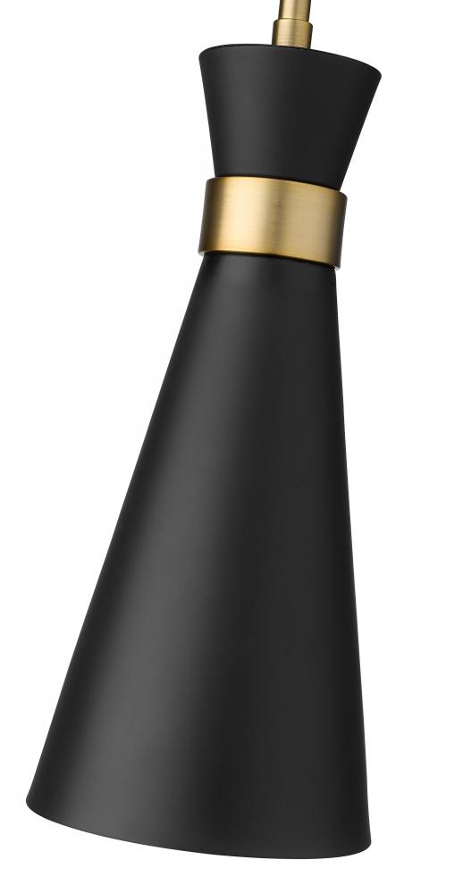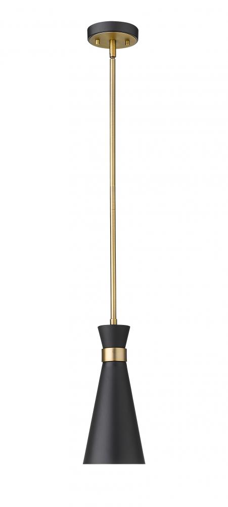 A decorative silhouette shapes industrial influence that adds casual elegance to this matte black finish metal mini-pendant. Dress up a compact space or nook with this tasteful fixture trimmed with heritage brass finish steel. This sleek mini-pendant captures the heart of romantic industrial charm.