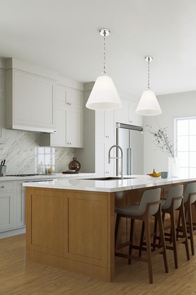The finely fluted texture of the frosted glass shade on the Alaric pendant offers subtle sophistication that complements the design elements of the pendants. Alaric can be ordered in a choice of Polished Nickel, Matte Black, and Modern Gold finishes to com