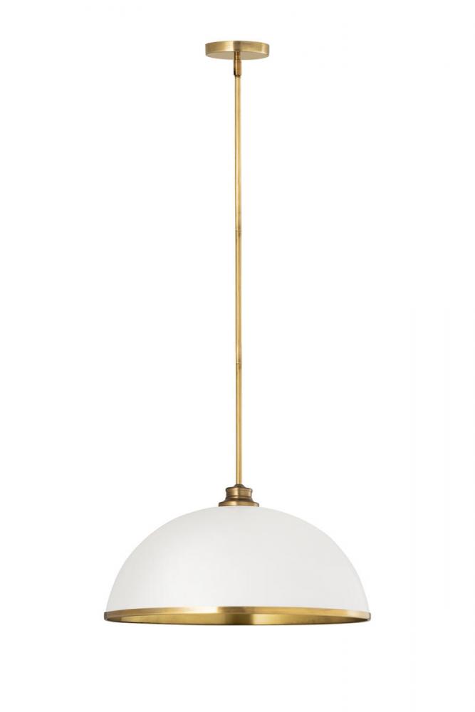 Sleek style takes on a modern look in this domed one-light pendant, a perfectly versatile way to illuminate a contemporary dining room, kitchen, or main living area. This pendant reflects myriad motifs including farmhouse, urban, and industrial, and brings simplicity with tasteful aesthetics. Crafted of matte white finish stainless steel, its accenting rubbed brass finish edge trim, down rod, and canopy deliver a decadent look.