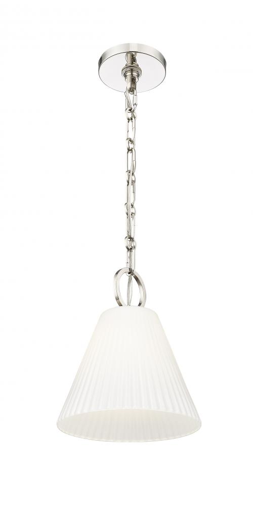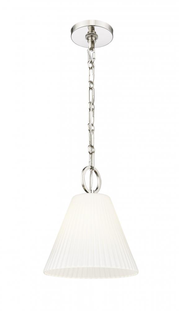 Glistening polished nickel is the perfect complement to the timeless character of a modern one-light pendant. From the Alaric collection, it delivers bright downlighting with a conical shade crafted in delicately fluted white glass. Beautiful over a kitchen island or adding accent illumination in a living area, this pendant sets a refined tone in your home.