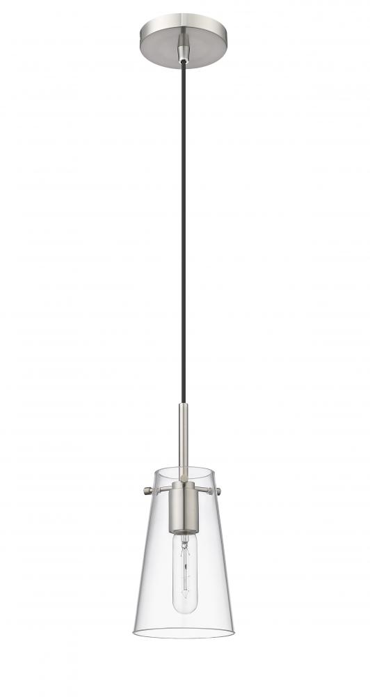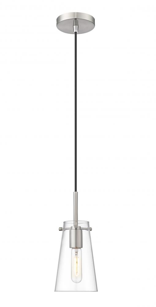 Clear glass defines a slim silhouette, bringing refined style to a modern one-light pendant. Its sleek brushed nickel finish sets the tone for a refined living space, kitchen or powder room. The gentle tapering cone silhouette of the pendant ensures its timeless look, perfect alone or in series lighting a larger space.