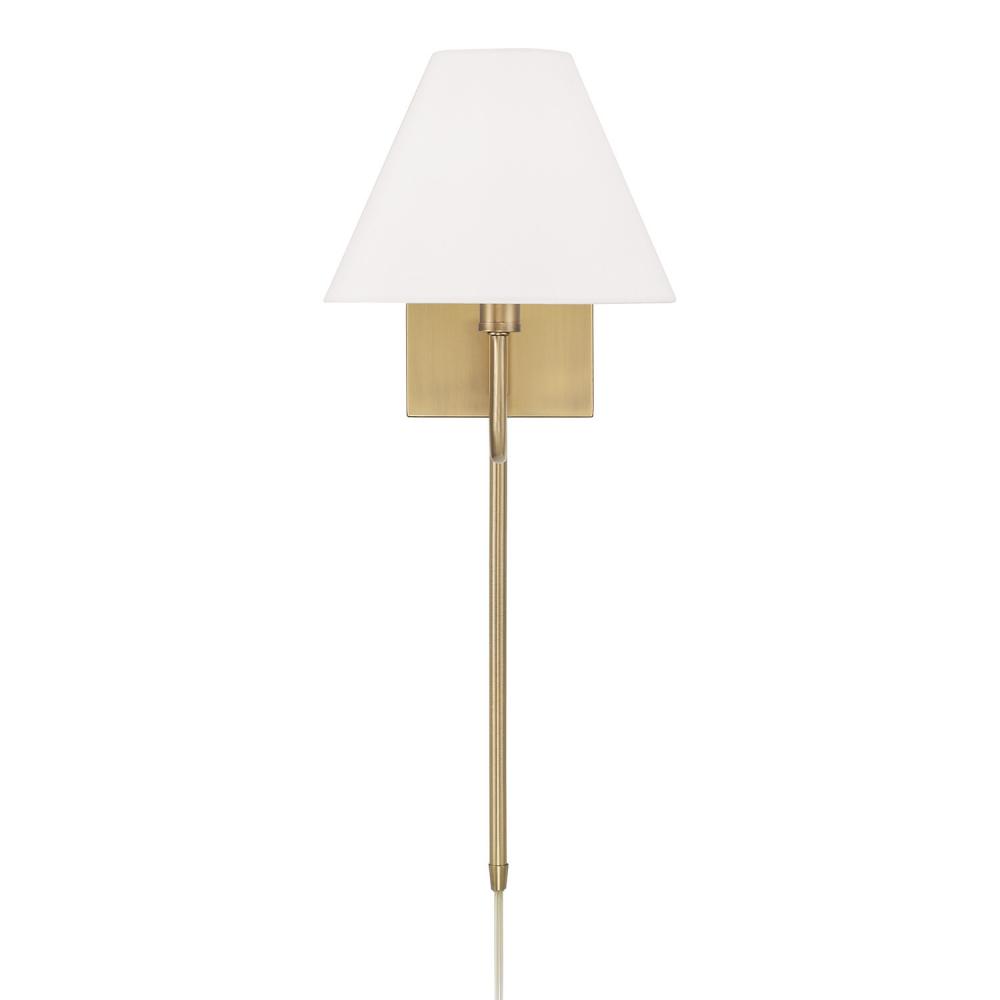 DETAILS: The Aged Brass finish enhances the angular design of the White fabric shade for sophisticated style. Plug-in optional with 12" cord cover and dimmer switch on backplate.