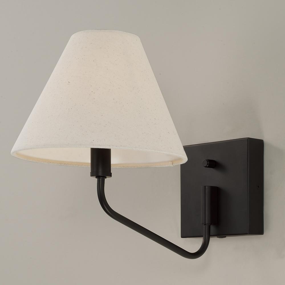 DETAILS: The Espresso finish enhances the angular design of the Soft Tan fabric shade for sophisticated style. Plug-in optional with 12" cord cover and dimmer switch on backplate.