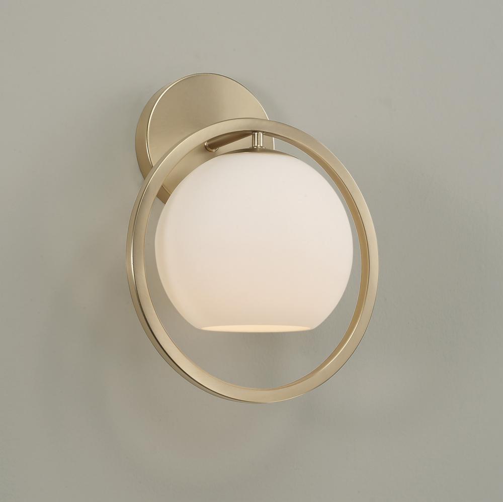 DETAILS: Curved contours in Soft White glass create sophisticated, modern style, accented by the subtle shine of the Matte Brass finish.