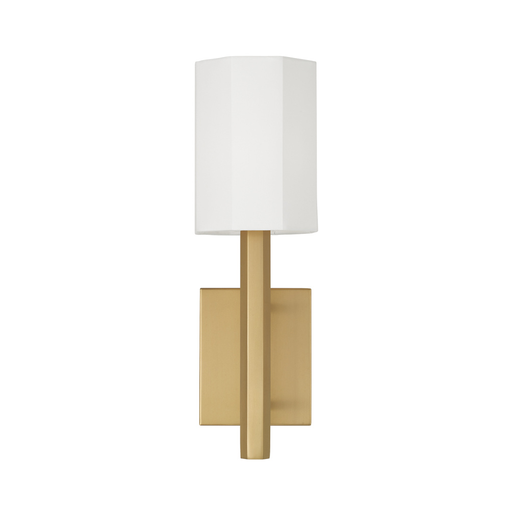 DETAILS: Finished in Aged Brass, the faceted candle sleeve and octagonal White fabric shade bring beautiful dimension to the classic form.