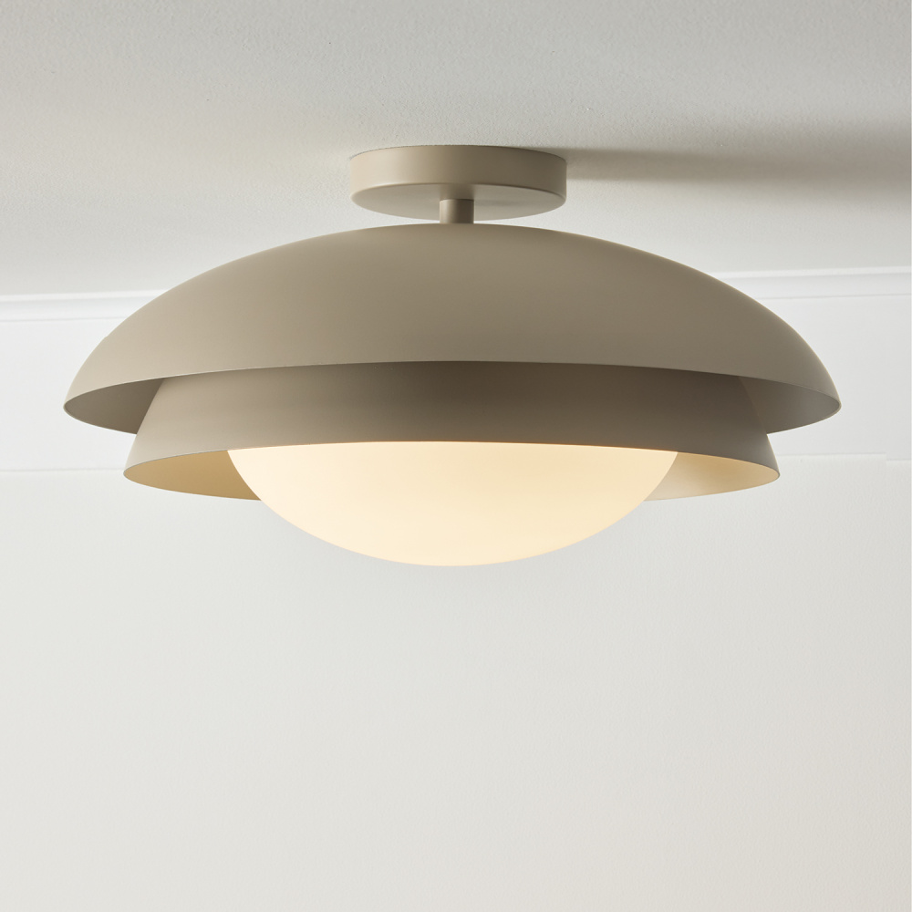 DETAILS: Finished in a serene matte Taupe hue, the nestled metal domes encompass a Soft White glass globe to create an all-around beautiful luminaire.