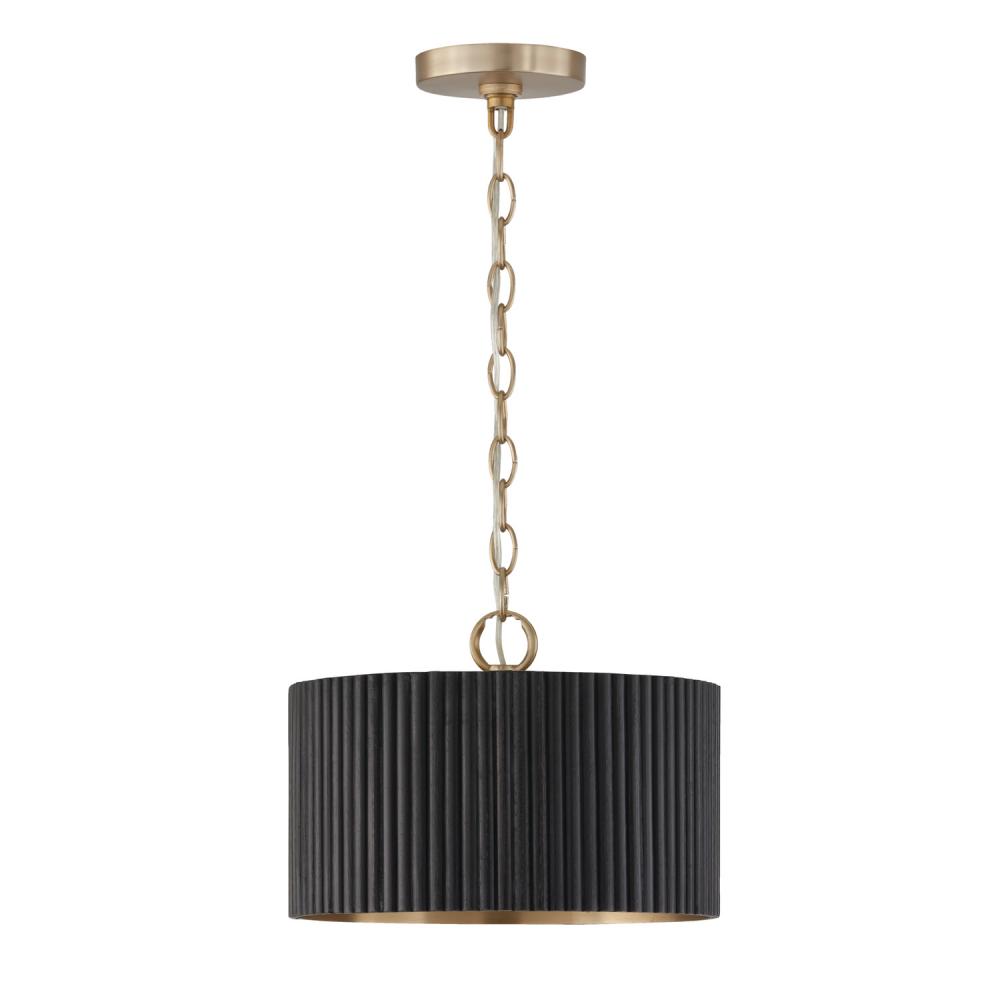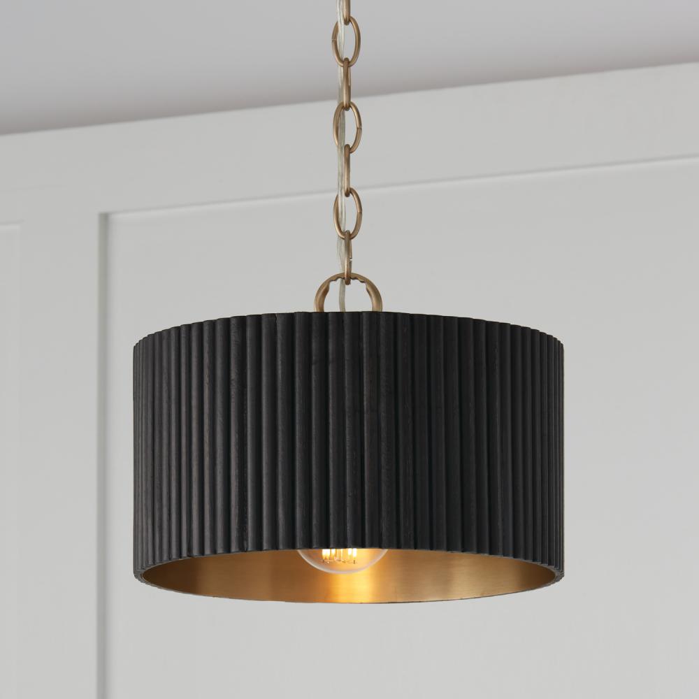 Artisan texture meets mid-century modern style in the Donovan Dual Mount Semi-Flush or Pendant. The Black Stain fluted mango wood shade evokes a natural elegance, while the Matte Brass interior adds a warm glow.
