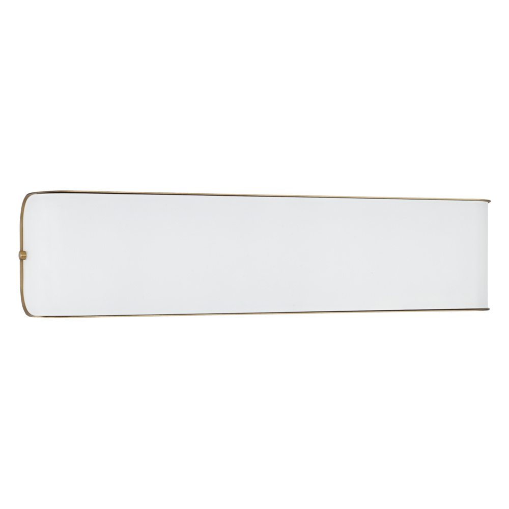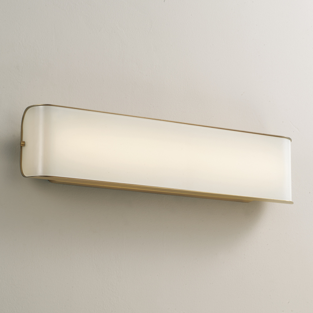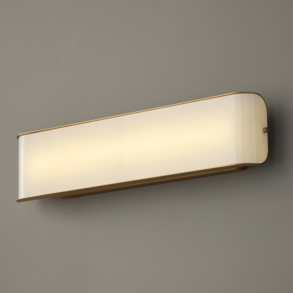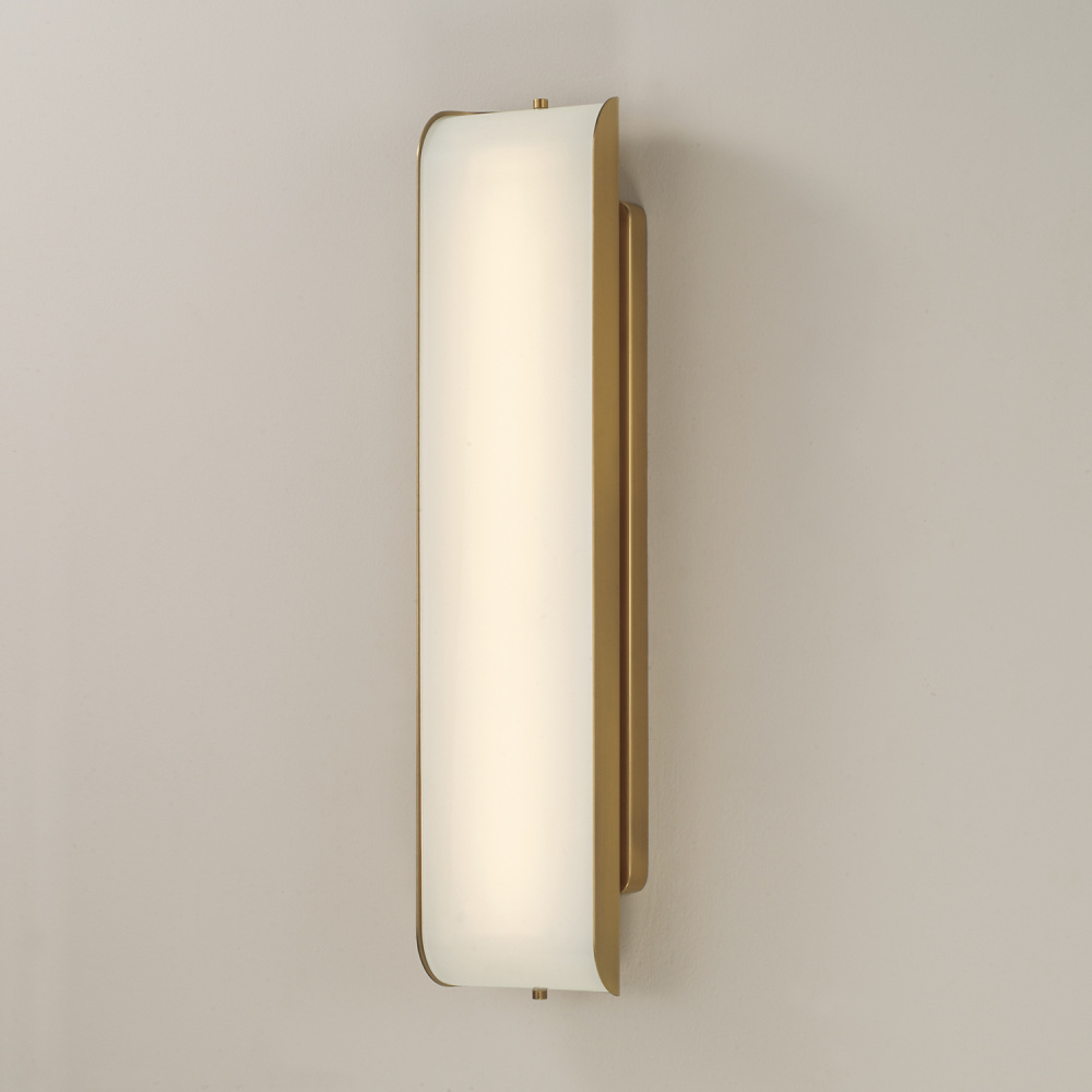 DETAILS: Grounded by an Aged Brass metal base, the curved glass panel creates a smooth, beautiful glow from the chic silhouette.