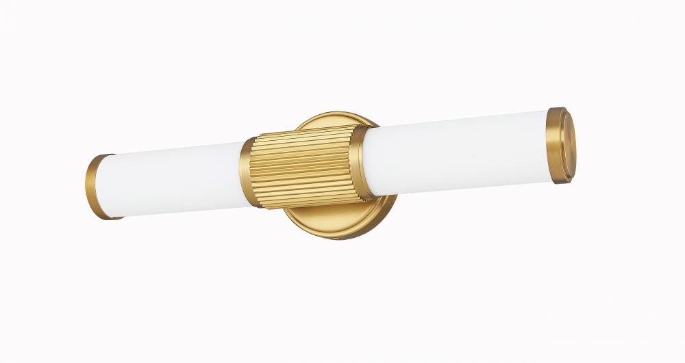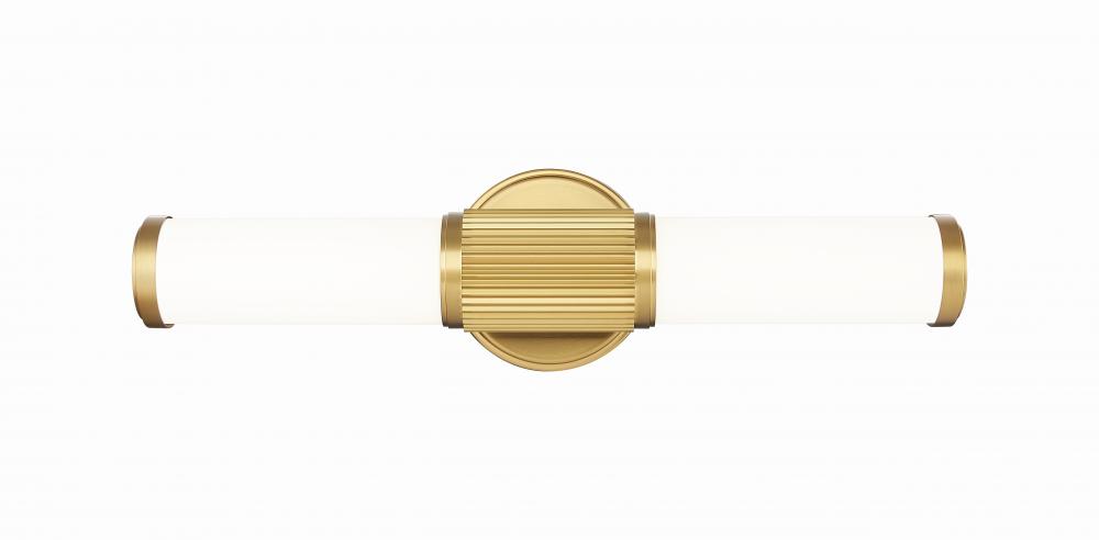 Infused with visual interest and dimensionality, this modern LED vanity bath light is a perfect upgrade for your home. It boasts a rich modern gold finish, instilling warmth and sophistication to a fluted cuff and beveled wall plate. Opal glass is a cool, refined choice, ensuring inviting illumination.