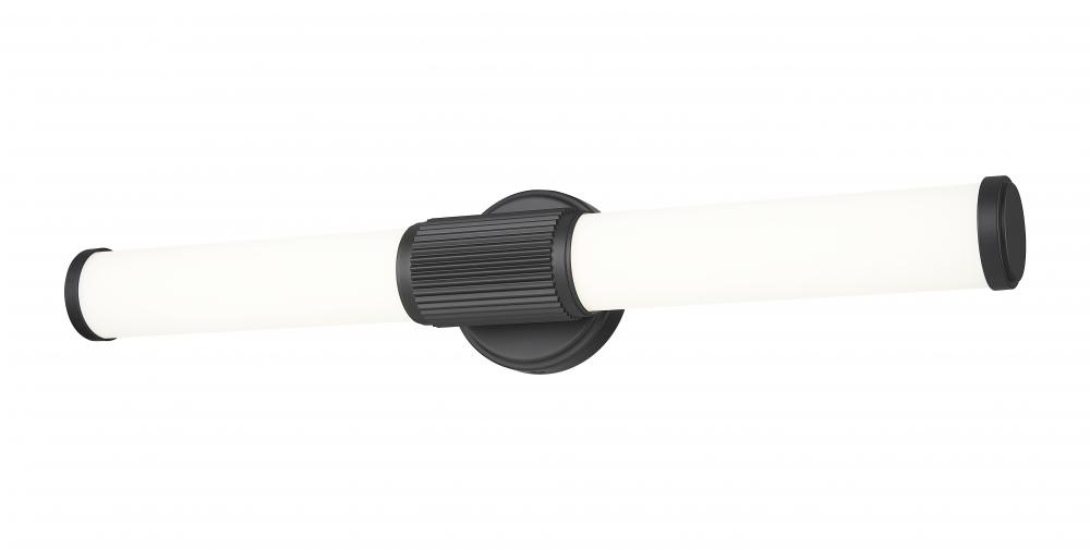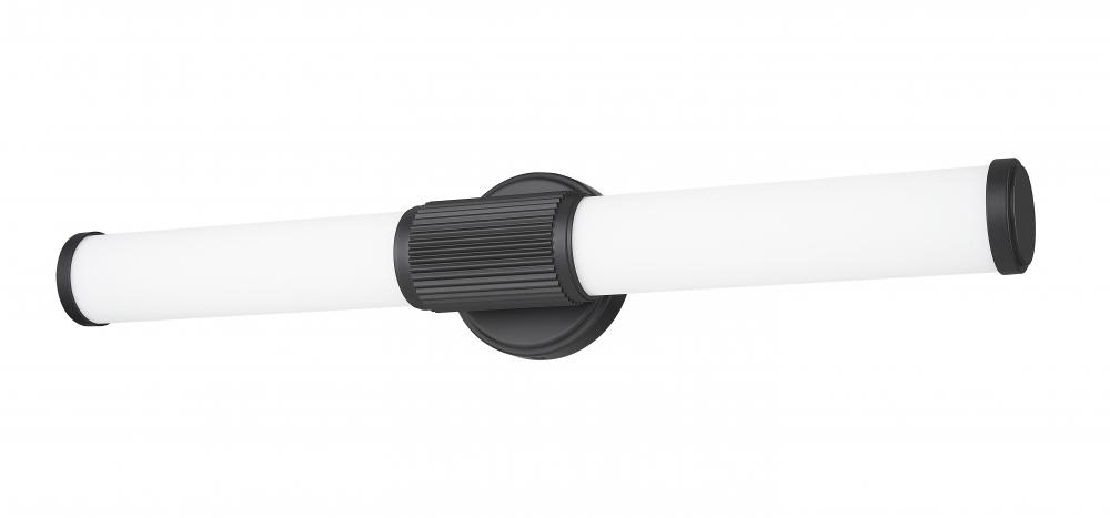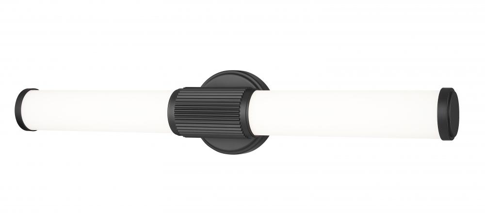 Smooth and fluted textural contrast creates a stylish presentation for this modern LED vanity bath light. It showcases a matte black finish, delivering a hint of industrial flair to your bath. Its fluted cuff and beveled wall plate are augmented with decorative end caps, adding a finished look and feel. The opal glass diffusers ensure wonderfully welcoming illumination while adding a hint of contrast and depth.