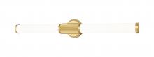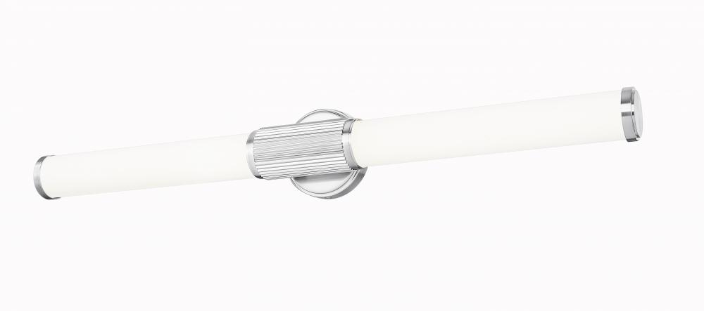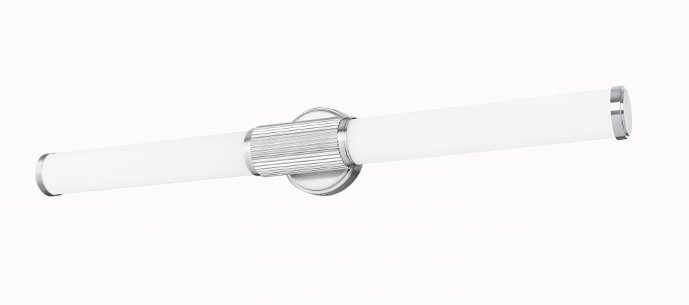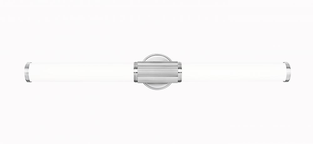 Step up to sophistication with this modern LED vanity bath light. Beautiful in an en suite, it boasts a generous length with cylindrical opal glass diffusers for inviting illumination. Its steel frame includes a smooth beveled wall plate and fluted cuff, all in an elegant brushed nickel finish that gleams in the light.
