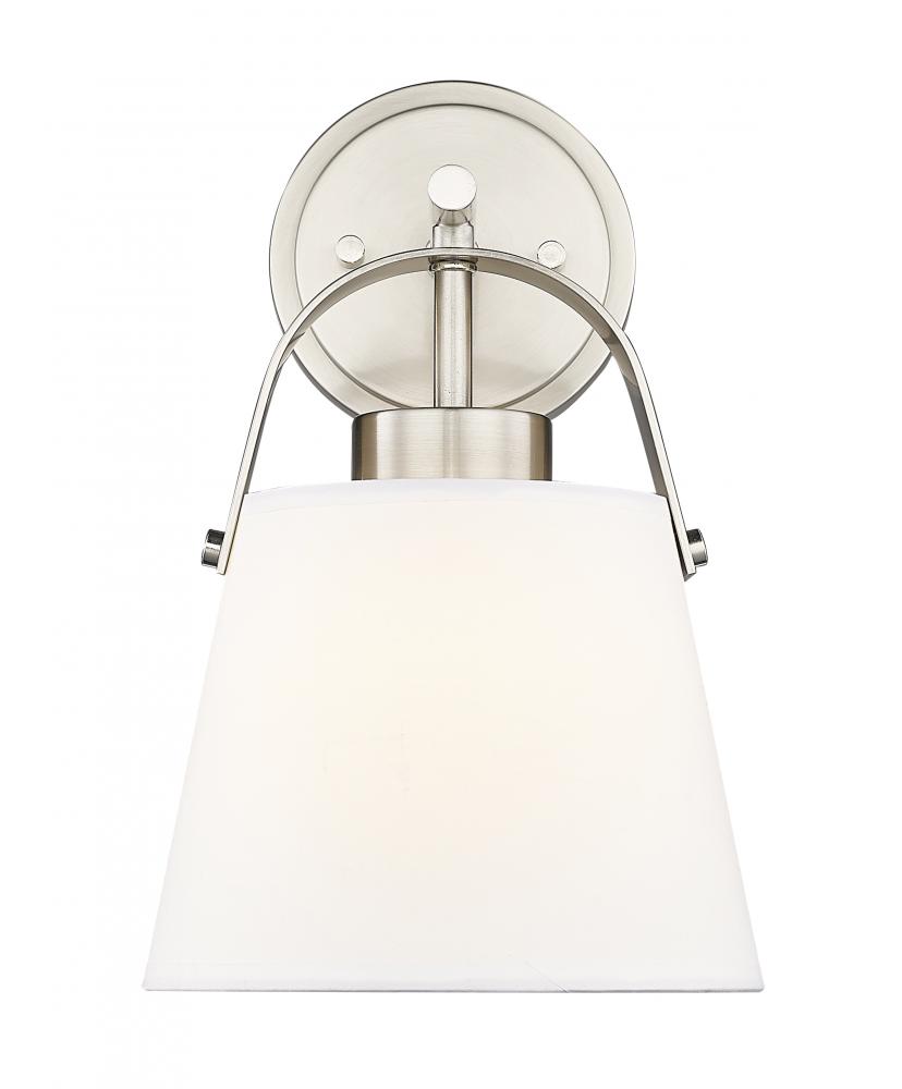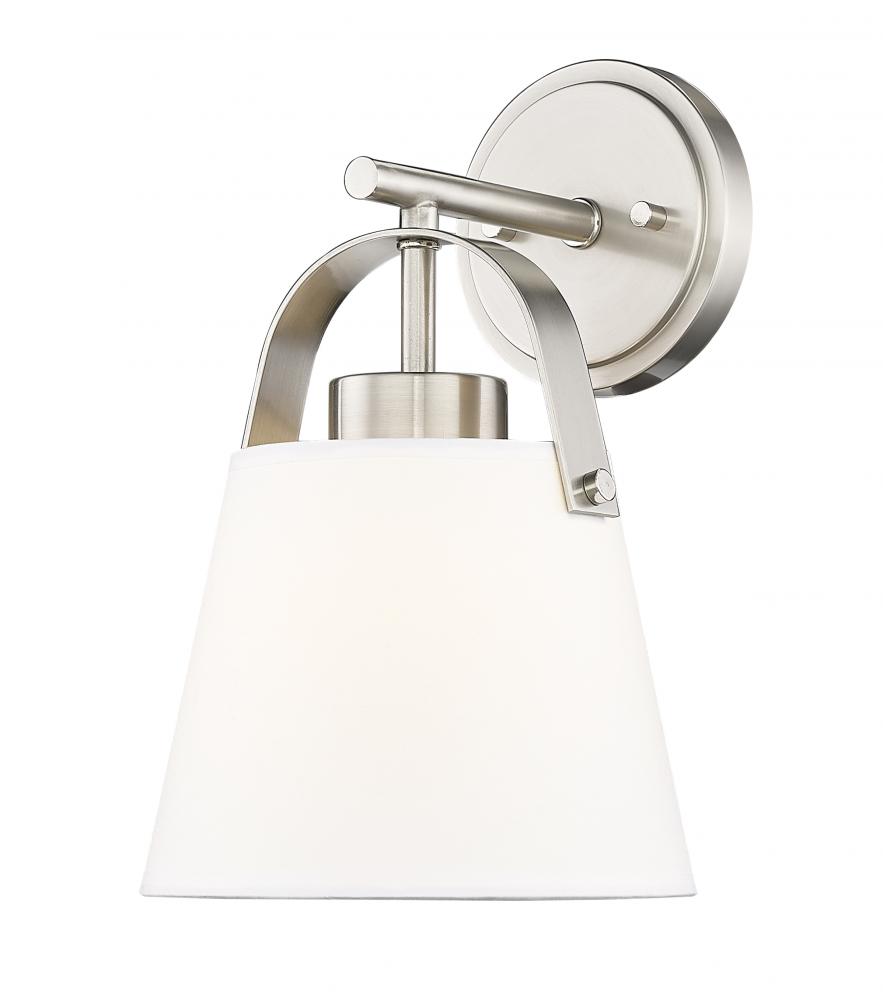 Weaving in a bit of nautical personality, this one-light pendant from the Z-Studio collection embodies versatility and charm. This fixture reflects a hint of farmhouse charm, coastal ease, and casual elegance all in one, with an open ivory fabric conical shade and ornate framing in brushed nickel finish steel. Explore possibilities in a casual living space with a wall sconce that embellishes an easy, carefree living space.