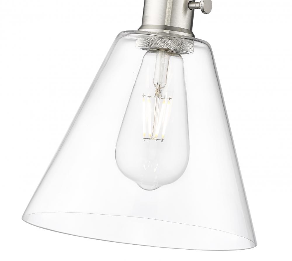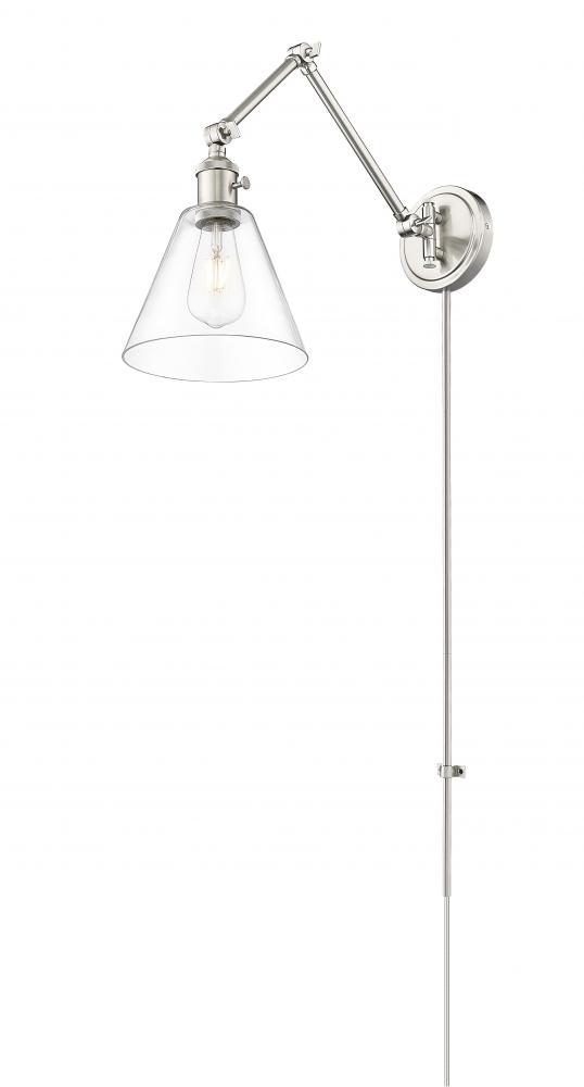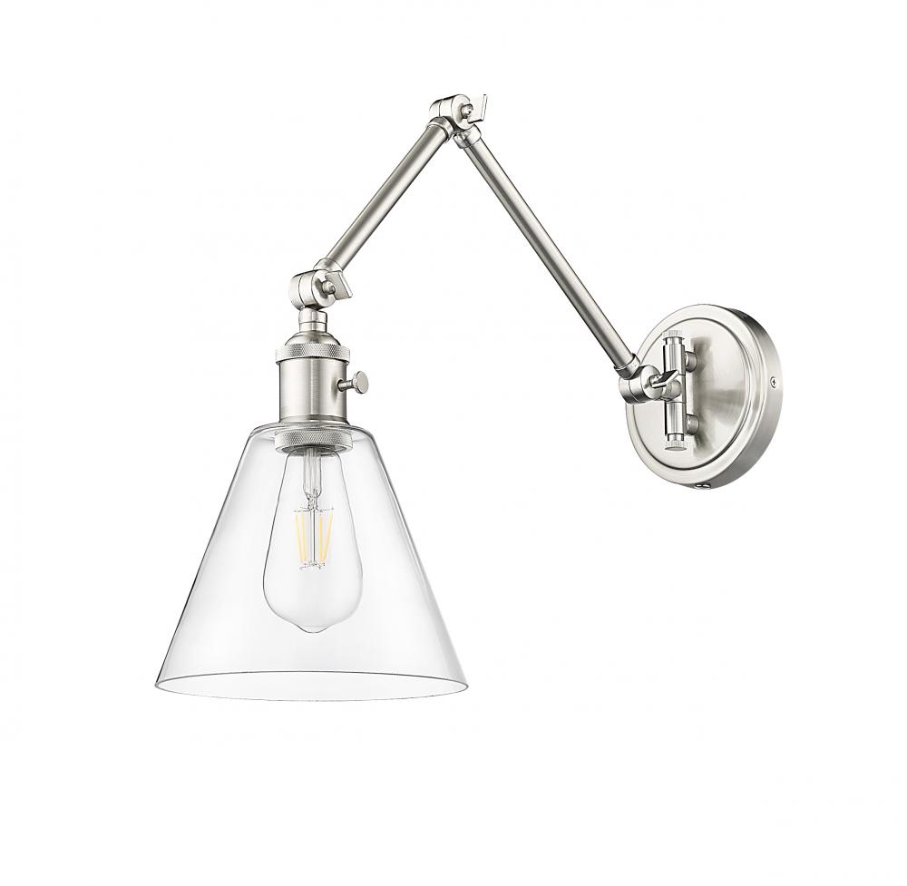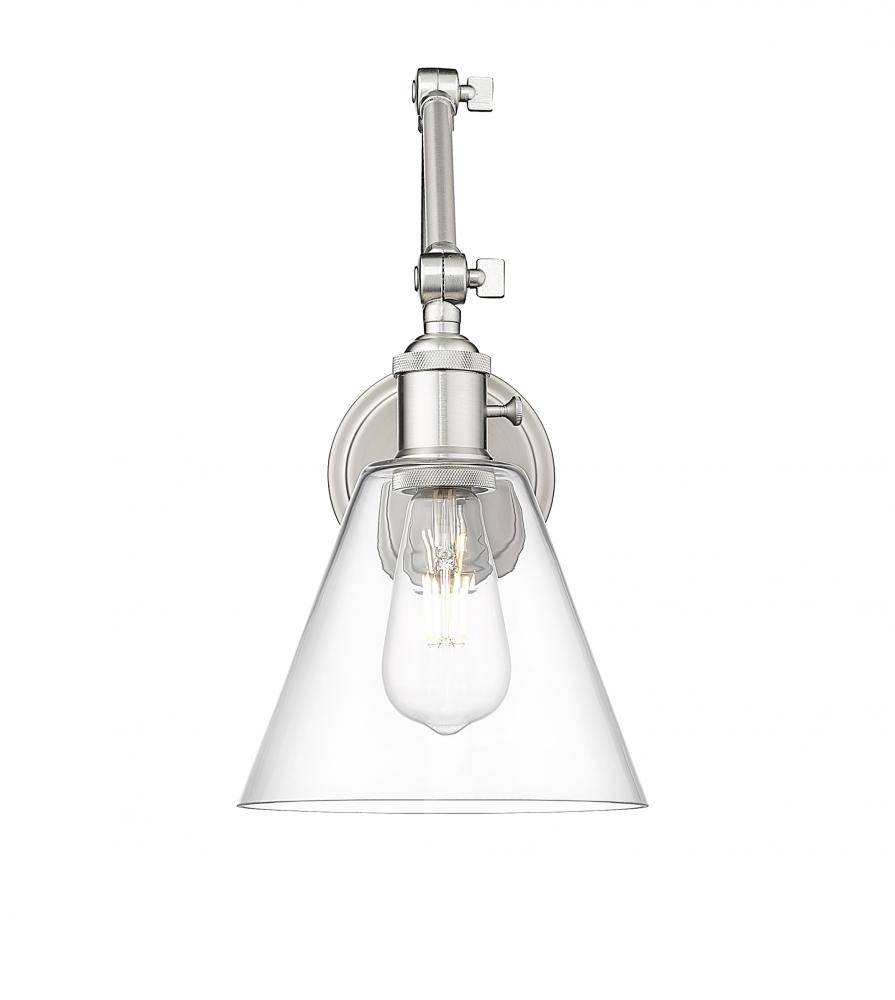 Mixed motifs offer an exquisite form of industrial style in a one-light wall sconce offering the perfect blend of glam and industrial design aesthetics. Constructed of chic brushed nickel steel framing and a conical clear glass shade, it delivers utility in an adjustable configuration making it easy to achieve customizable lighting levels. Install through hard-wiring or install cord-and-plug mounting to allow movement from space to space.