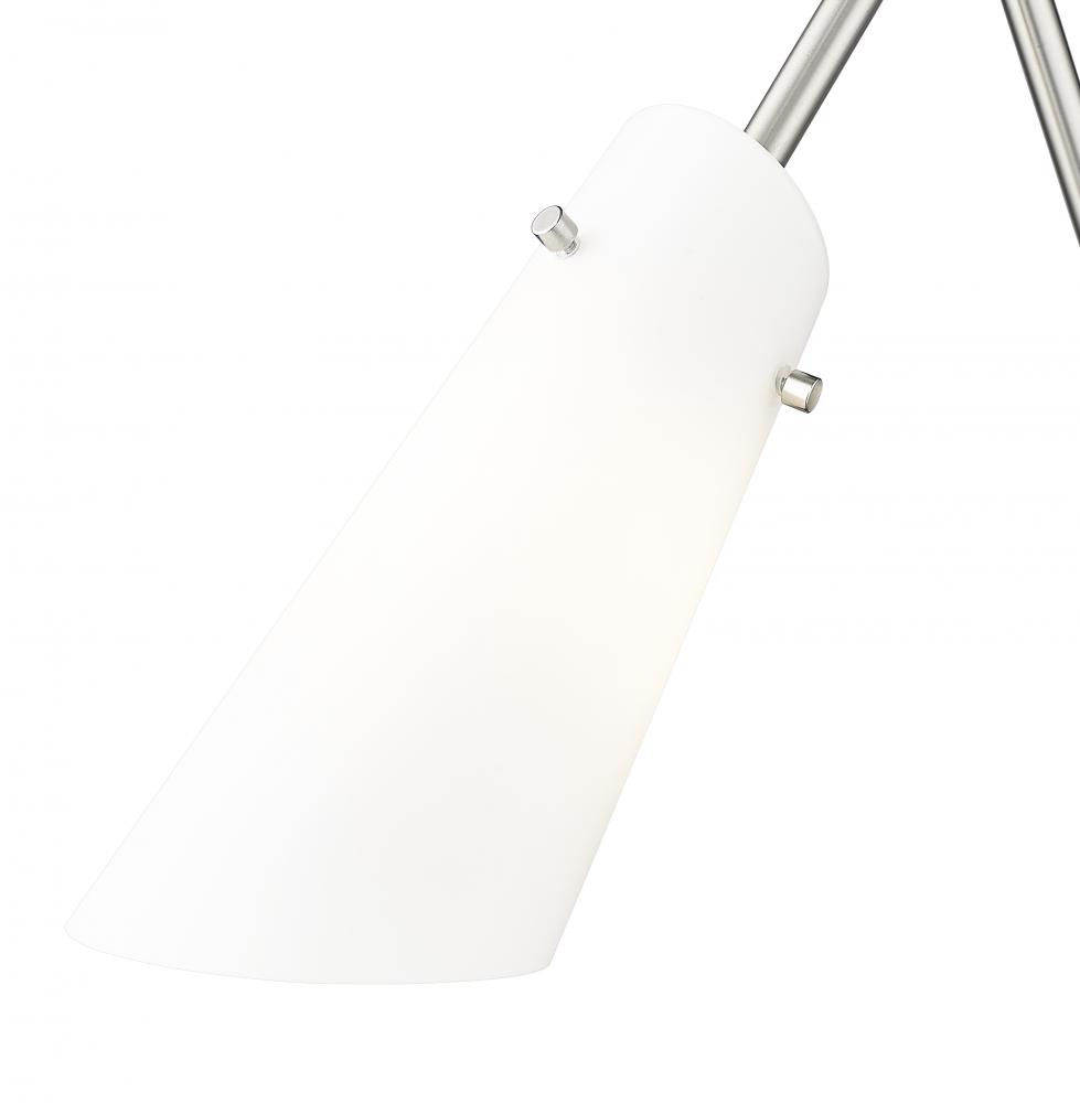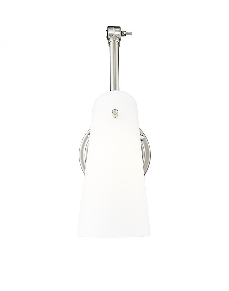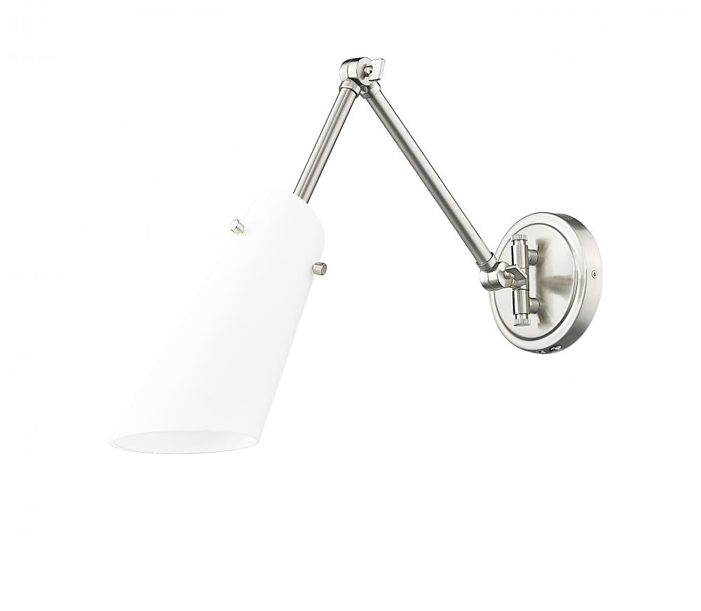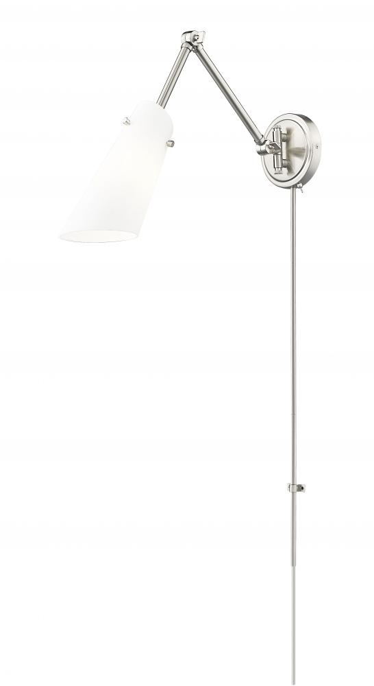 The Julia wall sconce, with its neutral white shade and contemporary look, boasts the convenience of adjustability due to an articulating arm for positioning the light exactly where needed. Available for hardwire installation or with an optional cord and p