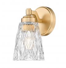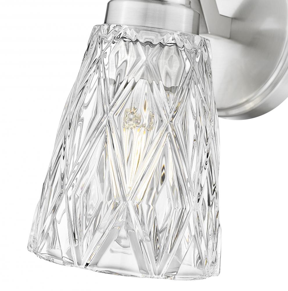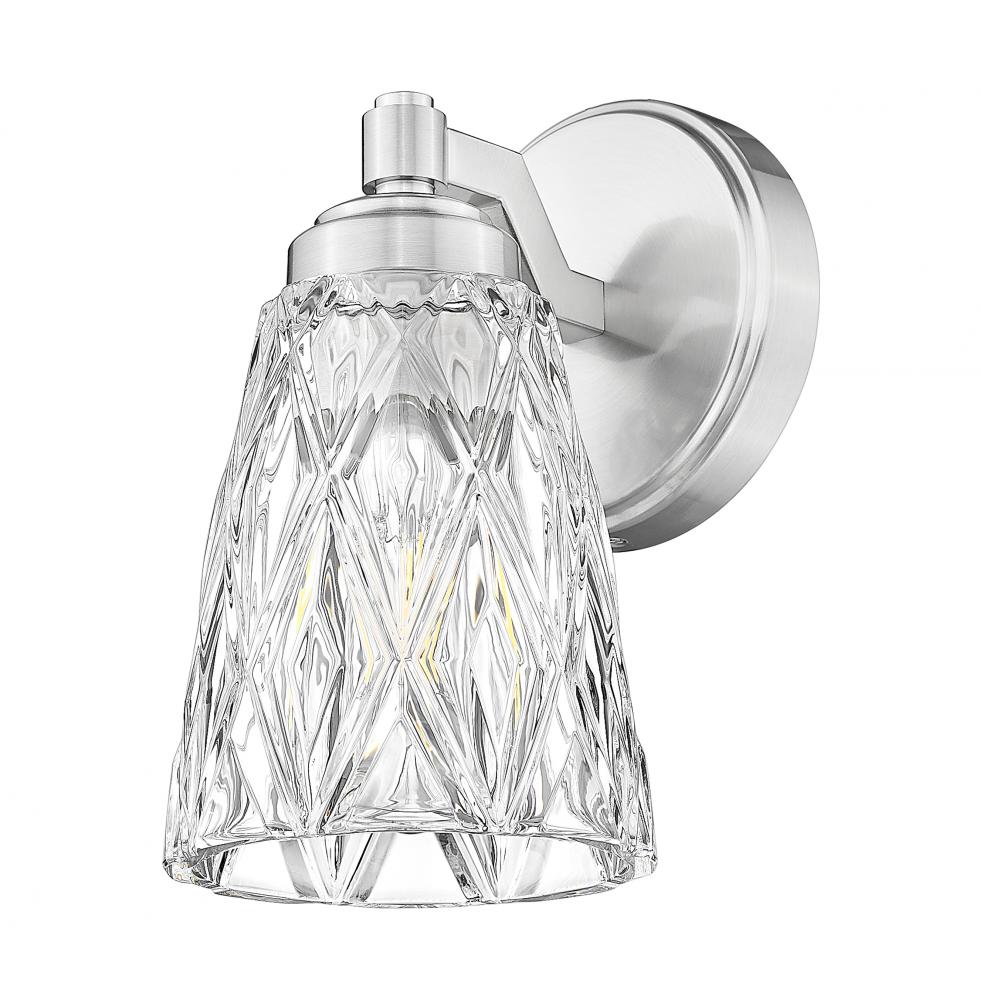 Texture embellishes sparkling glam in a one-light wall sconce lifting the ambience of interior living spaces. Classic materials of glass and metal merge to offer a fixture featuring overlapping diamond patterning on a conical clear glass shade, filtering against harsh glare. Brushed nickel framing complements this dimmable light source perfect for bath spaces and sophisticated living rooms.