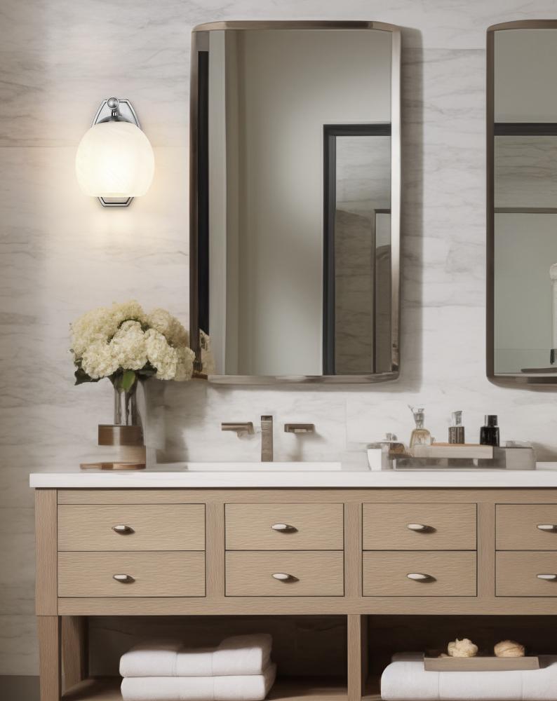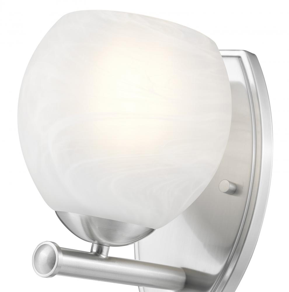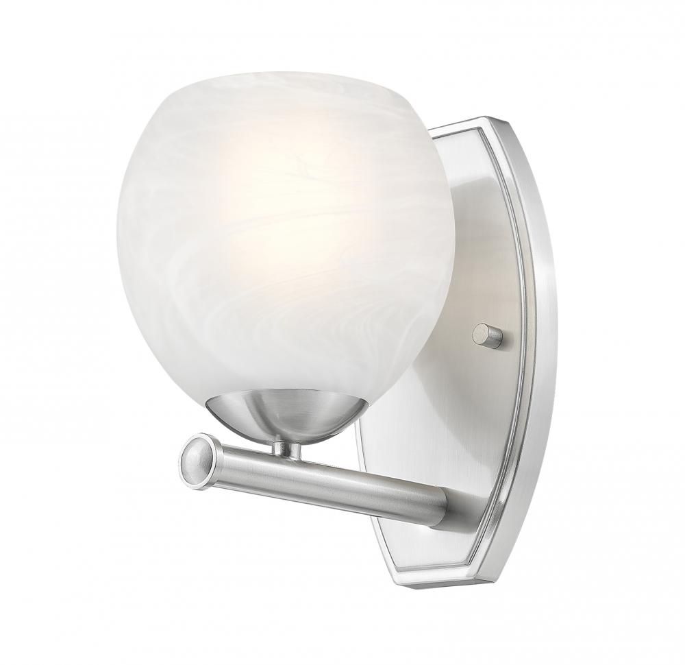 Brushed nickel finishing softens the modern effect of this chic one-light bathroom vanity wall sconce. Perfect for a variety of settings, it features clean, sleek curves in a rounded shade with a feathered opaque white swirl design that offers understated artisan character. Its a lovely addition to modern, mid-century and organic coastal decor motifs.