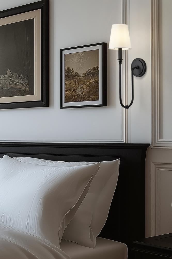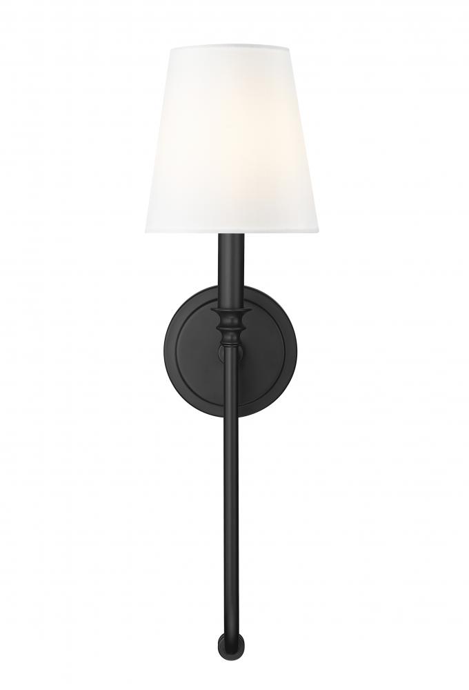 Follow the captivating curvature adding elegance to this one-light wall sconce, an exceptional fixture for bedrooms, living rooms, and hallways. Matte black finish steel framing creates a sleek silhouette with a deep bend in its arm and a prominent circular wall mount. A classic linen shade filters lighting with dimming features to control lighting levels.