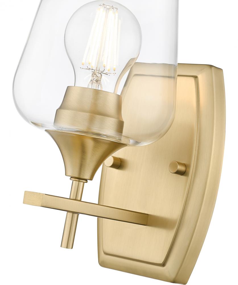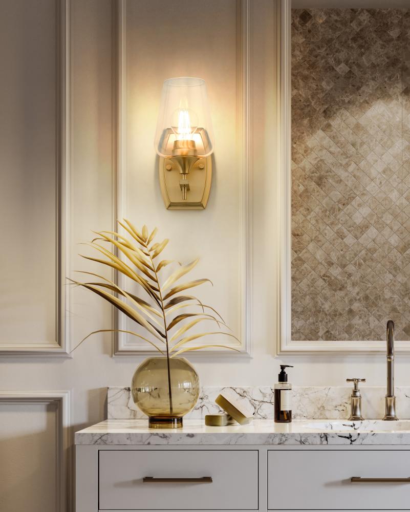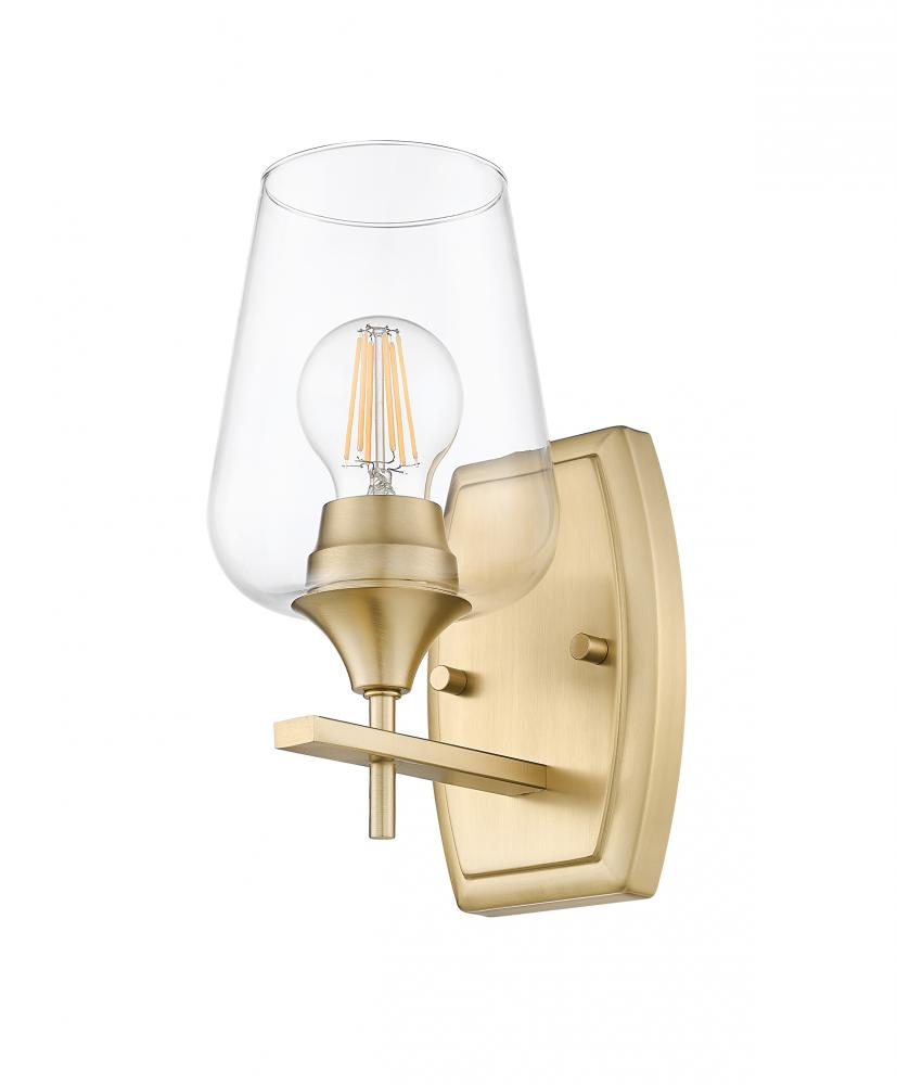 Opulence delivers a sophisticated look in interior lighting with this single-light wall sconce crafted of iconic metal and glass. Bring a luxe vibe with a tasteful fixture featuring detailed construction of burnished brass finish steel framing that offers subtle detail, and a sparkling clear glass goblet shade offering a view of its single bulb mount. Make this fixture a staple in upscale settings, enjoying dimmable illumination to customize light levels.