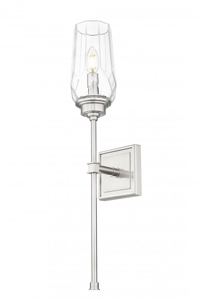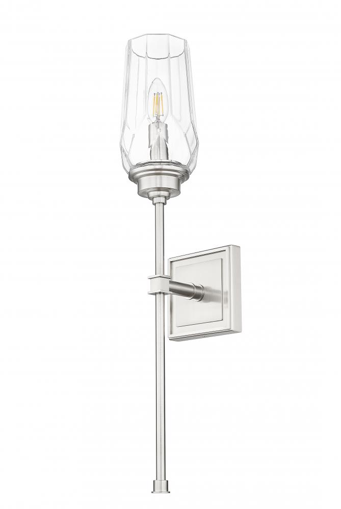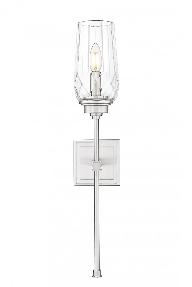 Unique diamond glass lends the perfect dose of sparkle and sophistication to this transitional one-light wall sconce. Its effect is punctuated with a slim stem and delicately beveled square wall plate, adding precision and dimensionality. Add it on either side of a mantel or doorway for added decorative impact.